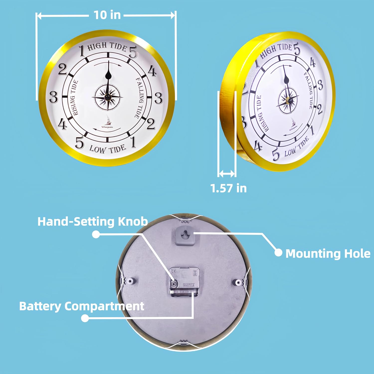 The Weegeeks Tidal Wall Clock gives you a glimpse of the state of the tides! This tide clock is 10 inches by 10 inches. Our high tide and low tide clock is very easy to read, telling you if the tide is in or out, and how much time is left before high or low tide. Our tide clocks use a silent sweeping motion and will be silent in your home. Tide timers are a must-have nautical clock for anyone with a coastal home, boat, fisherman, swimmer, surfer, beach walker, beach dweller, or anyone who loves the ocean! They provide a simple and reliable way to display the tides. They provide a simple, reliable way to track high and low tides! Tides run on lunar time. The tides operate on moon time, where each tidal day has 24 hours and 50 1/2 minutes, so high and low tides do not occur at the same hour each day. The hand of the tide timer easily shows how many hours until the next high or low tide in your area. Tide clocks are recommended for use on both coasts of the United States and Canada. In the Atlantic, they never need to be adjusted. They need to be calibrated periodically in the Pacific Ocean, including Hawaii. Tide clocks do not operate in the Gulf of Mexico. Tide clocks do not run in the Gulf of Mexico.