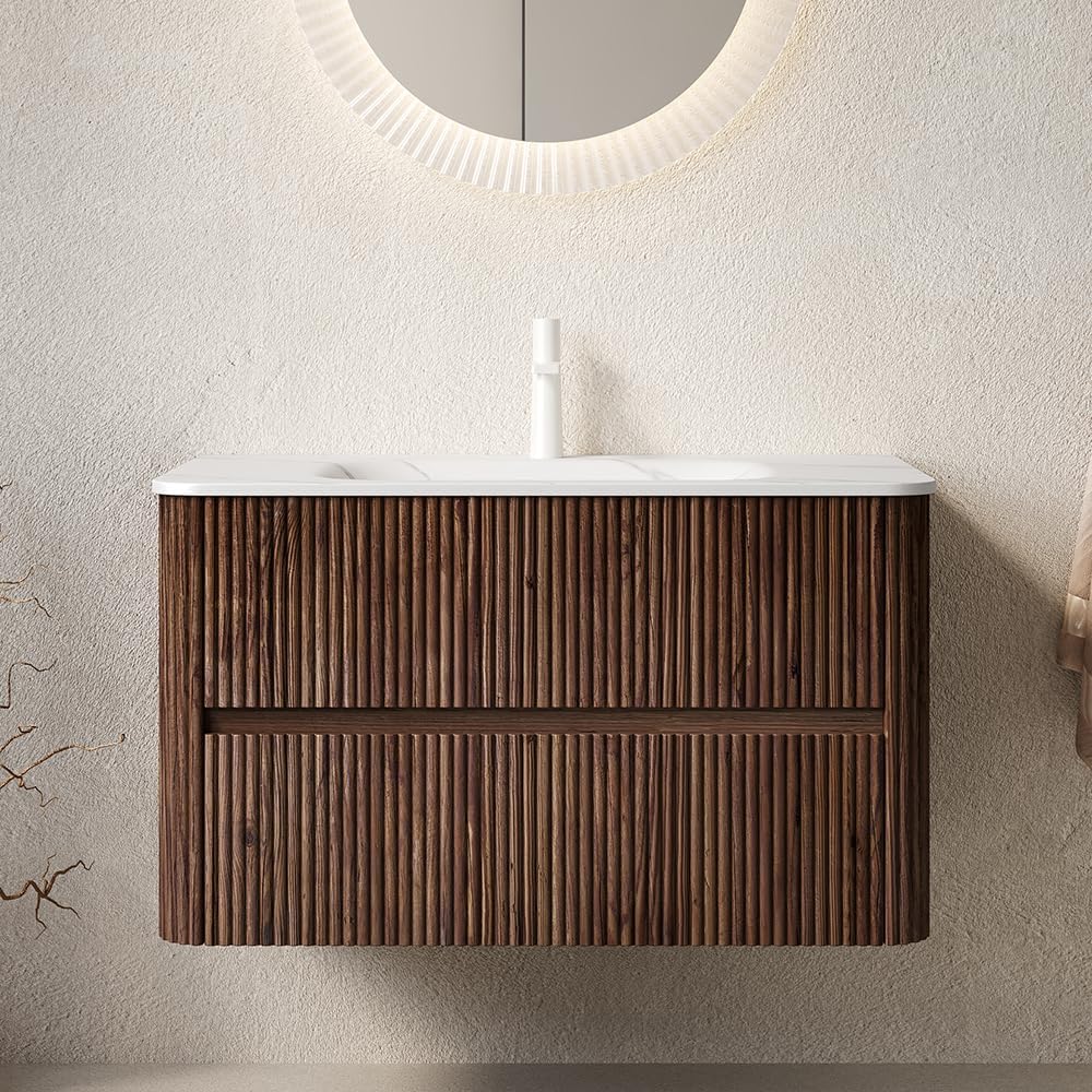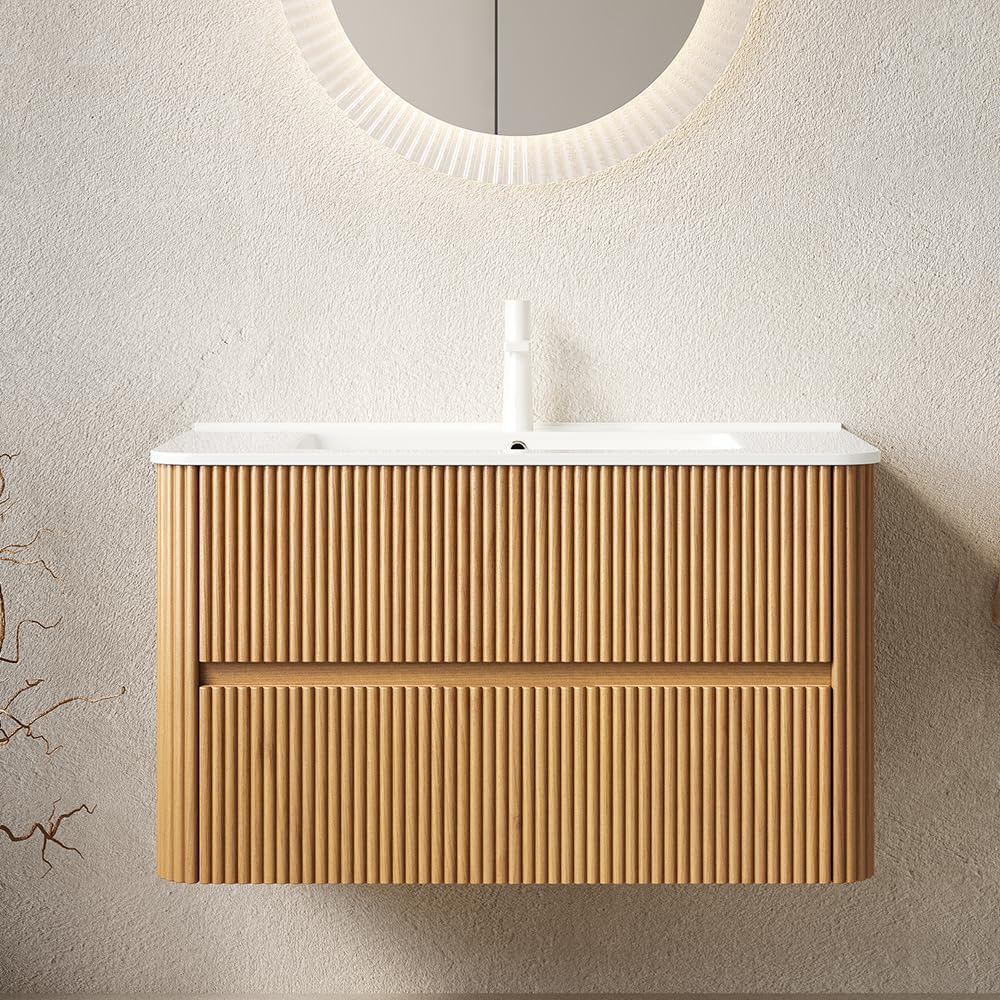 Bathroom Vanity with Sink, Modern Floating Vanity with 2 Push Close Soft Close Drawer, Ceramic Basin with Sink Hole Cover and Drain, Oak & Plywood-Sedona, Light Oak