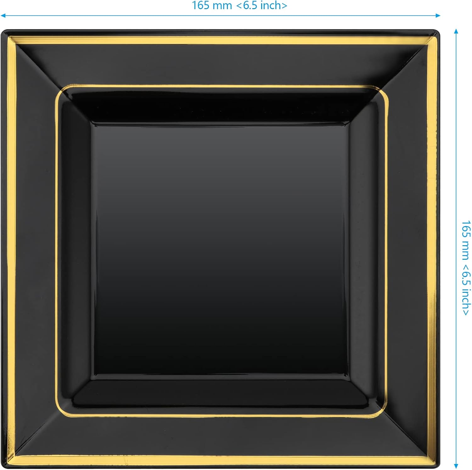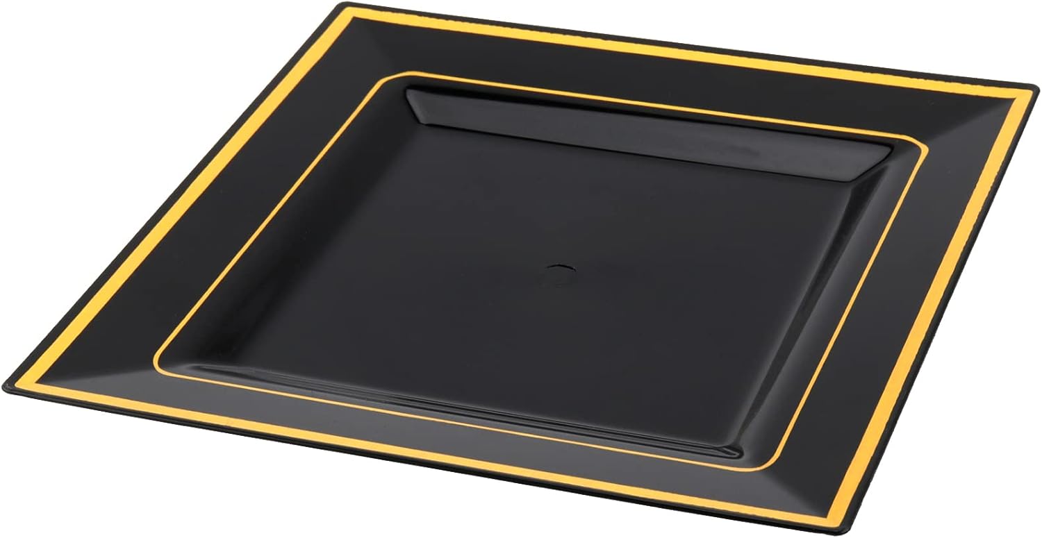 About Us We take "Satisfaction, Enthusiasm, Hospitality, Optimism, Integrity" as our criteria to serve every customer. SEHOI tries its best to provide practical and economical black plastic plates so that our customers can enjoy a convenient and pleasant online shopping experience. Why Choosing SEHOI? Value 120 packs of black square plastic plates with gold rim, each size is 6.5 x 6.5 Inches, which is enough to install a variety of foods you like.Made of high-quality plastic, the disposable square dinner plates are sturdy, durable, can resist snap, bending and broken. Free of BPA, they can be directly contact with food. They are easy to clean, and can be reused after hand washing, or you can directly thrown them away to save time and energy of cleaning. Note: Do not put them in microwave oven and dishwasher. The square black gold plastic plates have exquisite and elegant appearances, which can perfectly match various occasions. They are very suitable for annual anniversary, camping, party or wedding. Product Details:Material: PS Plastic Size: 6.5 x 6.5Inches Color: Black Package Contents:120 x Square Plastic Plates with Gold Rim