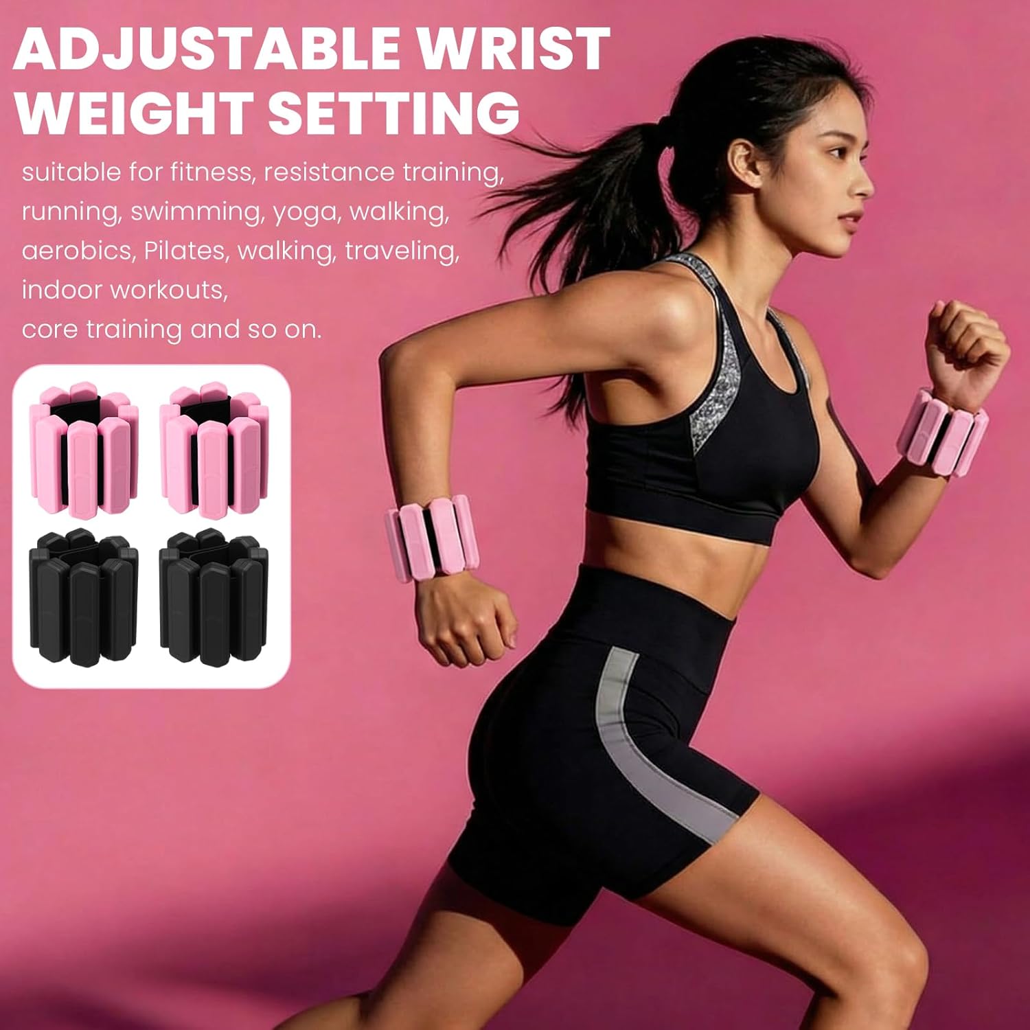 Features: Enhances Workout Efficiency & Muscle Strength: These 2 pound wrist weights add appropriate resistance to workouts, helping strengthen arm shoulder and core muscles. They improve body coordination and endurance, making ordinary exercises more effective for fitness goals. Portable Compact for On The Go Fitness: With lightweight and compact design, these silicone wrist weights are easy to carry and store. They take up little space, allowing fitness enthusiasts to train anytime anywhere whether at home outdoors or during business trips. Specifications: Material: silicone Color: pink, black Size: Adjustable (fits most wrist sizes) Weight: 1LB set 0.5LB each, 2LB set 1LB each Package includes: 2 Pairs x wrist weights for women Notes: Manual measurement, please allow slight errors on size. The color may exist a slight difference due to different screen displays Please use our sports equipment scientifically under safe conditions, and note that improper use may cause the risk of injury. Pregnant women please consider carefully before use