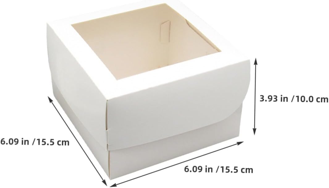 Package List 25 x Cake Boxes Characteristics -Paper cake packaging boxes: made from recyclable materials, these paper bakery boxes offer a sustainable solution for packaging cakes and treats, reducing environmental impact - and sturdy baking boxes: crafted from paper, these bakery boxes with window safe storage and transportation of cakes, pastries, and other baked goods cupcake individual container -Material:Paperboard,PVC -Multifunctional pastry containers: for various desserts, these boxes with lids for food can be used for cupcakes, muffins, strawberries, and more, catering to diverse bakery needs small pastry boxes -Color:White -Product Info: Baking packaging boxes -Size:15.50X15.50X10.00cm/6.09X6.09X3.93in -Clear window for enhanced presentation: the transparent window design of these pastry boxes with window allows customers to view the contents, adding a professional touch to your bakery packaging bakery boxes with window -Compact and portable cake holder: these small cake containers are designed for easy transport, making them ideal for carrying cakes, cupcakes, and other desserts treat boxes for cupcakesGoods Descriptionsweet cake boxes These bakery cake boxes are ideal for takeout, present, or showcasing your baked creations.single cupcake boxes Designed for versatility, these paper bakery boxes with window are for storing and displaying desserts like mousse, pies, or cupcakes.cupcake carrier Their compact design makes them suitable as small cake containers or pastry packaging boxes