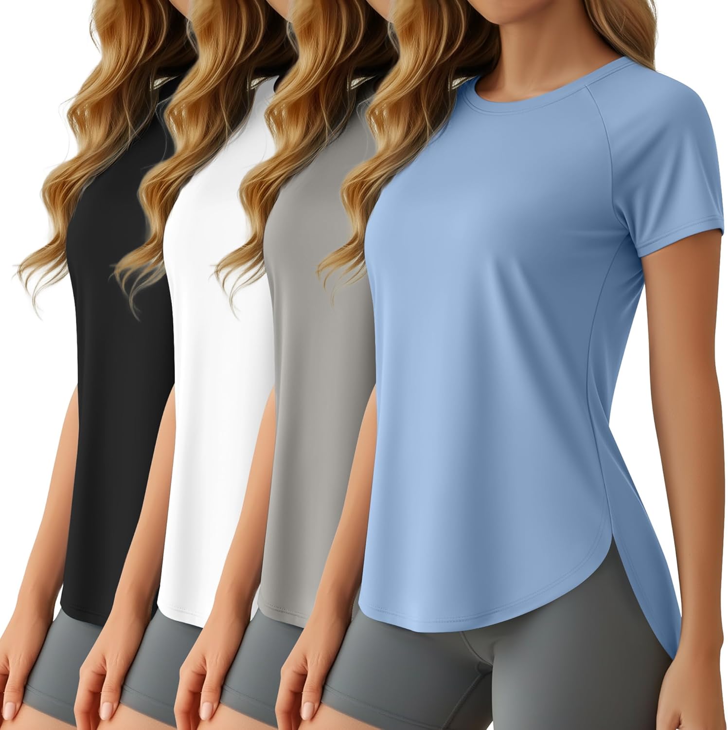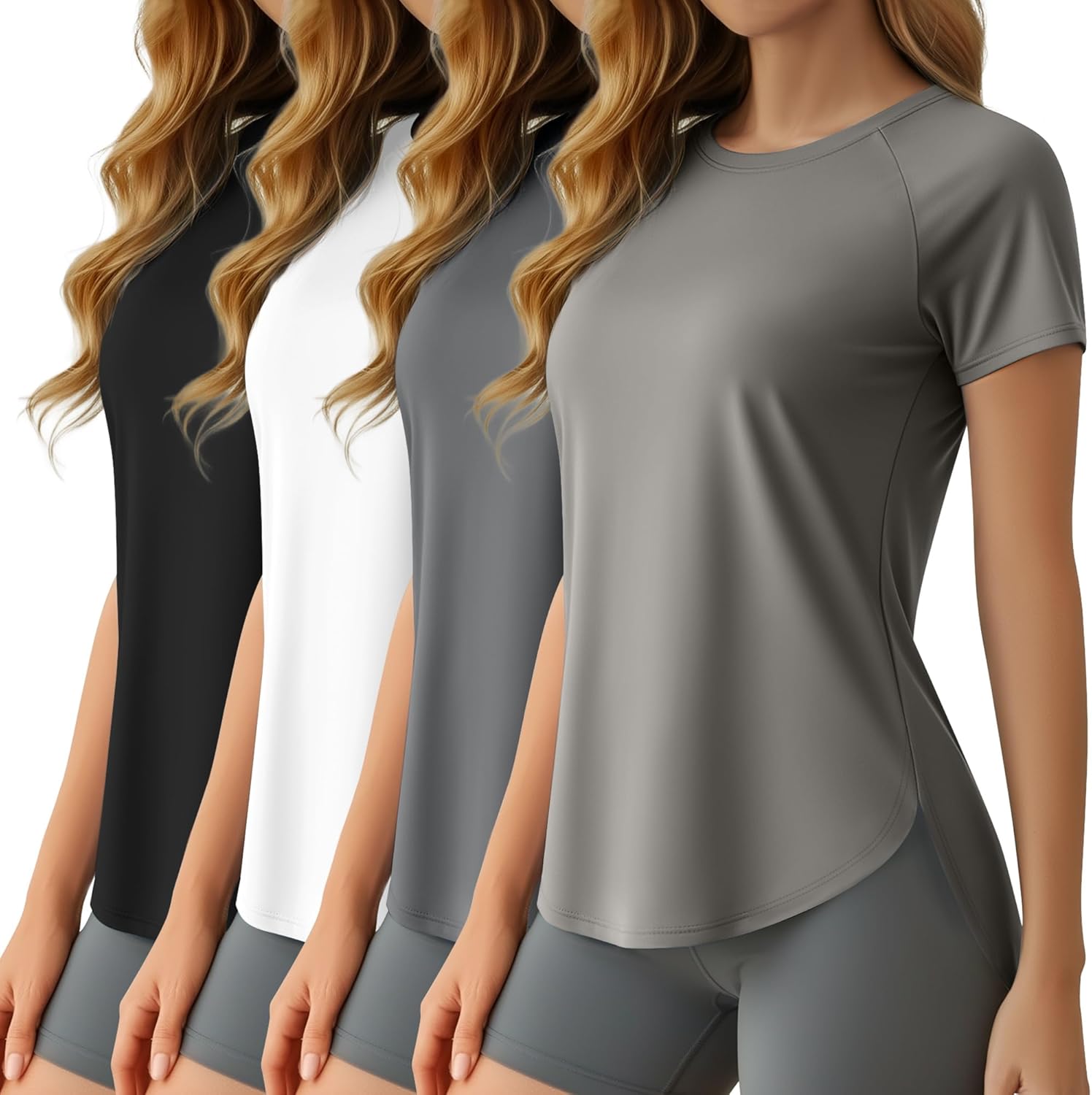 Features: These women's short sleeved shirts are your thoughtful present choice, ideal for yourself or as a birthday, anniversary, or holiday present for your friends These sports t-shirts come in a variety of different sizes, so you can choose the size that suits your body shape. Specifications: Material: 95% Polyester, 5% Spandex Package includes: 4 x Women's short sleeve shirts Notes: Manual measurement, please allow slight errors in size. The color may have a slight difference due to different screen displays