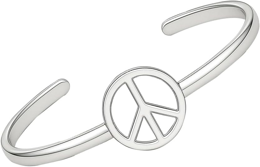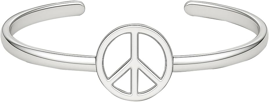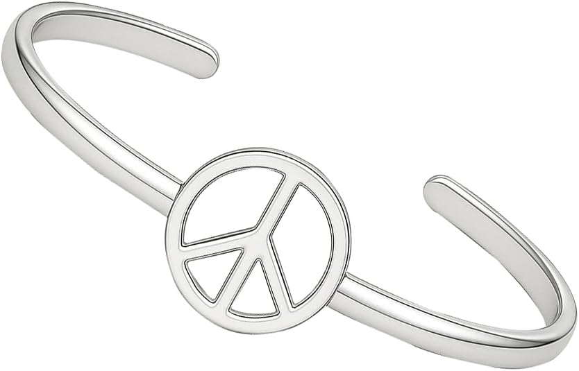 Make a bold statement for peace with this elegant Sterling Silver Peace Sign Bangle Bracelet. Crafted from genuine 925 sterling silver, this handmade cuff bracelet features a timeless peace symbol design with a split shank band that adds a contemporary twist to this retro-inspired piece. The openable design ensures easy wear while maintaining a secure fit. Perfect for teens and women alike, this versatile piece can be styled with both casual and dressy outfits. The simple, clean lines and polished finish create a sophisticated look that speaks to both fashion and meaning. From Saanvi Jewellery, this cuff bracelet serves as a beautiful reminder of harmony and makes for a meaningful accessory or thoughtful gift. The adjustable nature of this bangle ensures comfortable wear for most wrist sizes, while the durable sterling silver construction promises lasting beauty.