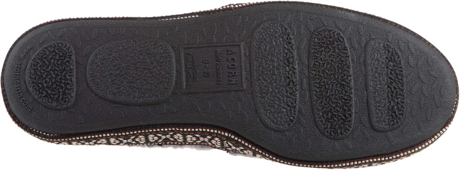 The Woven Trim Moc features clean lines and fuzzy textiles. Inspired by all the features you love in our classic Acorn Moc. This Woven Trim Acorn Moccasin Slipper has been reinvented one thread at a time featuring a two tone berber upper, multi-color side wall and durable rubber outsole.