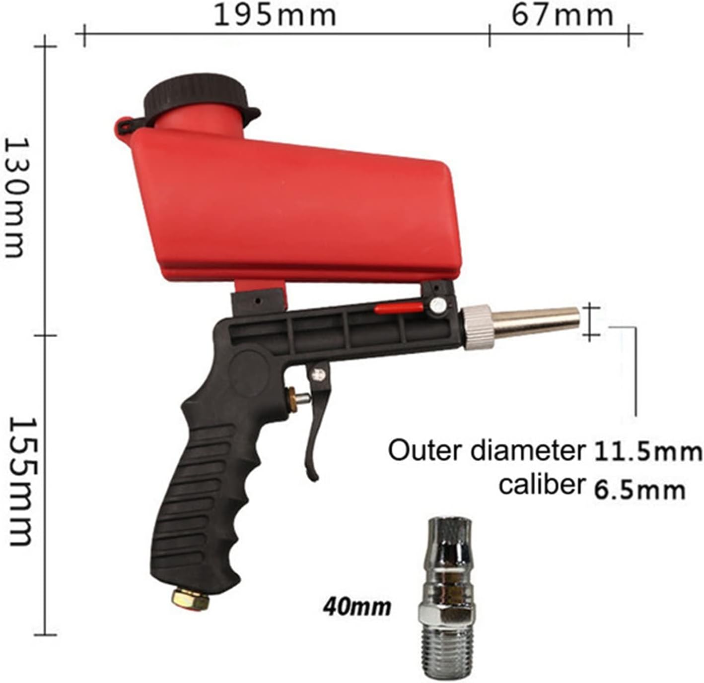Features:1. The blasting flow can be adjusted, and the nozzle can be replaced;2. Comes with a shell, large capacity, convenient loading.3. The air inlet interface has a filter to prevent blockage.4. 100% brand new productSpecifications:Name: Hand sandblasterSize: about 23.3*17*6cm/9.17*6.69*2.36inWeight: about 600gMaximum pressure: 90 PSITank capacity: 500mlAir consumption: 6 cfm@90PSINo-load speed: 6000RPMAir inlet: 20 filters, 1/4"Abrasive size: 46-100Spray hole diameter: 5mmPacking List:1*sandblaster2*nozzle1*operation manual