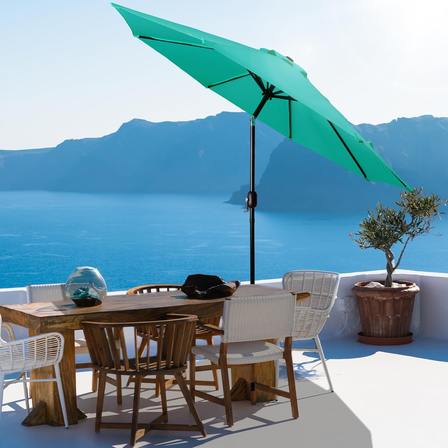 Enhance your outdoor living space with the Backyard Expressions 9 Ft Patio Umbrella. Crafted with durability and style in mind, this umbrella is designed to provide optimal shade and protection from the sun's harmful rays. Made from 180g UV resistant polyester fabric, it ensures long-lasting use and vibrant color retention. With 8 sturdy ribs and a crank system, opening and closing the umbrella is effortless. The push-button tilting feature allows you to adjust the angle for customized shading. Perfect for both residential and commercial settings, this umbrella is an essential addition to any patio, deck, or garden area.