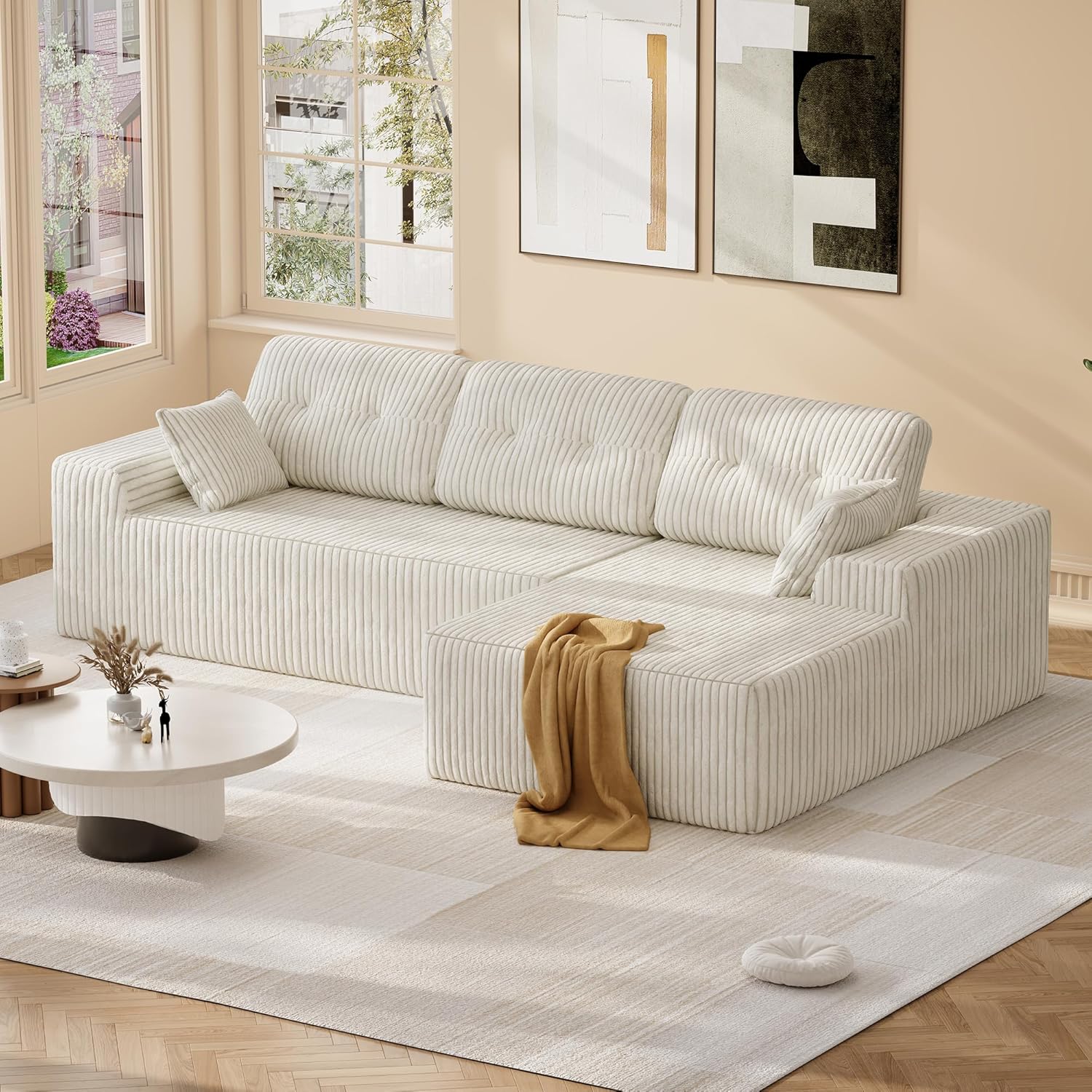 Specifications: Overall Dimensions: 106"W × 68"D × 26.4"H Seat Depth: 57" deep chaise, 84" wide loveseat Seat Height: 18" Weight: Net 145.64 lbs Package Dimensions: 2 boxes – 44.1" × 15.7" × 15.7" each Package Weight: 74.14 lbs & 86.24 lbs (may arrive separately) Available Colors: Black, Gray, Beige Material: Premium soft corduroy fabric, breathable, wrinkle-resistant, and pet-friendly Cushion Filling: 32D high-density foam with built-in spring support for plush, balanced, and supportive comfort Design: Boneless modular sectional, L-shaped with chaise, flexible 4-layout configurations Assembly: No assembly required; simply unpack, lightly pat, allow up to 72 hours to regain full shape Care: Spot clean or wipe with a damp cloth; removable covers for easy maintenance Ideal For: Living rooms, apartments, condos, studios; family- and pet-friendly