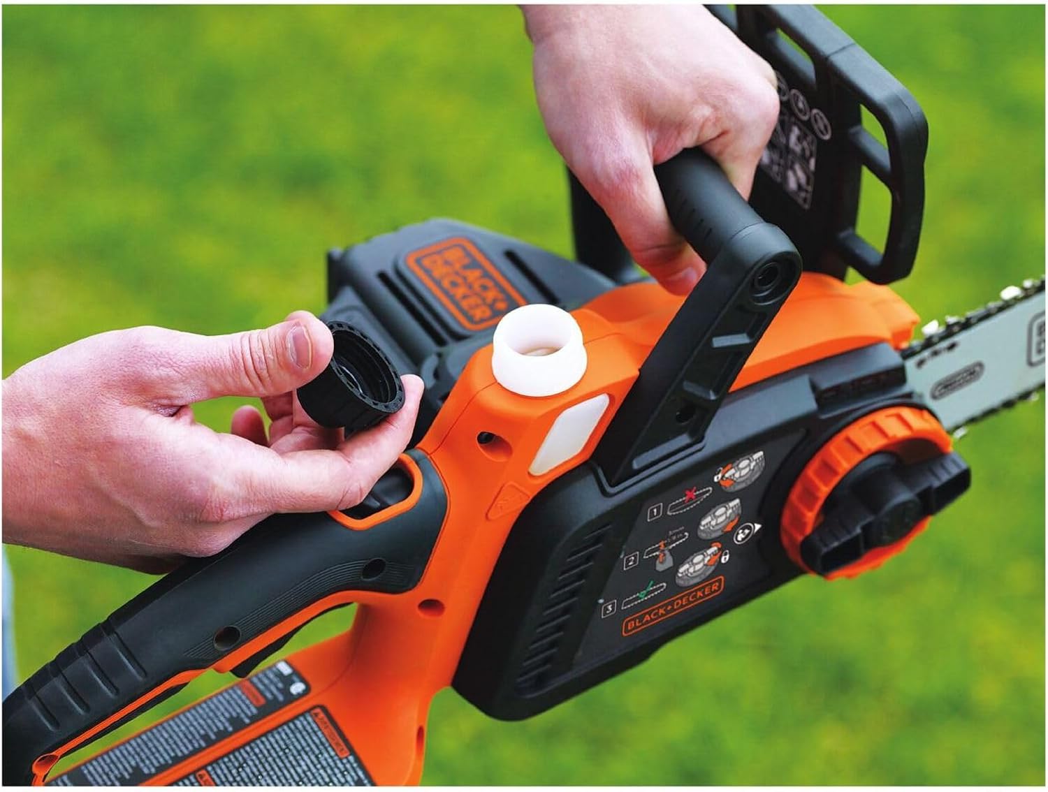 Whether you're tackling routine yard maintenance or a big creative project, you know only the best tools will do. BLACK+DECKER’s 40V MAX* cordless chainsaw offers power and convenience. Don't be fooled by this battery-operated chainsaw’s lightweight maneuverability—on a full charge, it can power through an average of 60 4x4 pine lumber cuts before you’ll need to recharge (battery not included). Thanks to a wraparound grip handle for increased versatility, you’ll even be able to use this chainsaw in angled orientations. A 12 in. OREGON low-kickback bar and chain allow for smooth, fast cuts, while tool-free chain tensioning ensures seamless adjustments. This chainsaw is also equipped with an automatic oiling system, so that lubricating the bar and chain is simple and straightforward. Design elements like a front hand guard and a lock-off button put your safety at the forefront, and when you're not using your chainsaw, the guide bar scabbard protects the blade. *Maximum initial battery voltage (measured without a workload) is 40 volts. Nominal voltage is 36 volts.