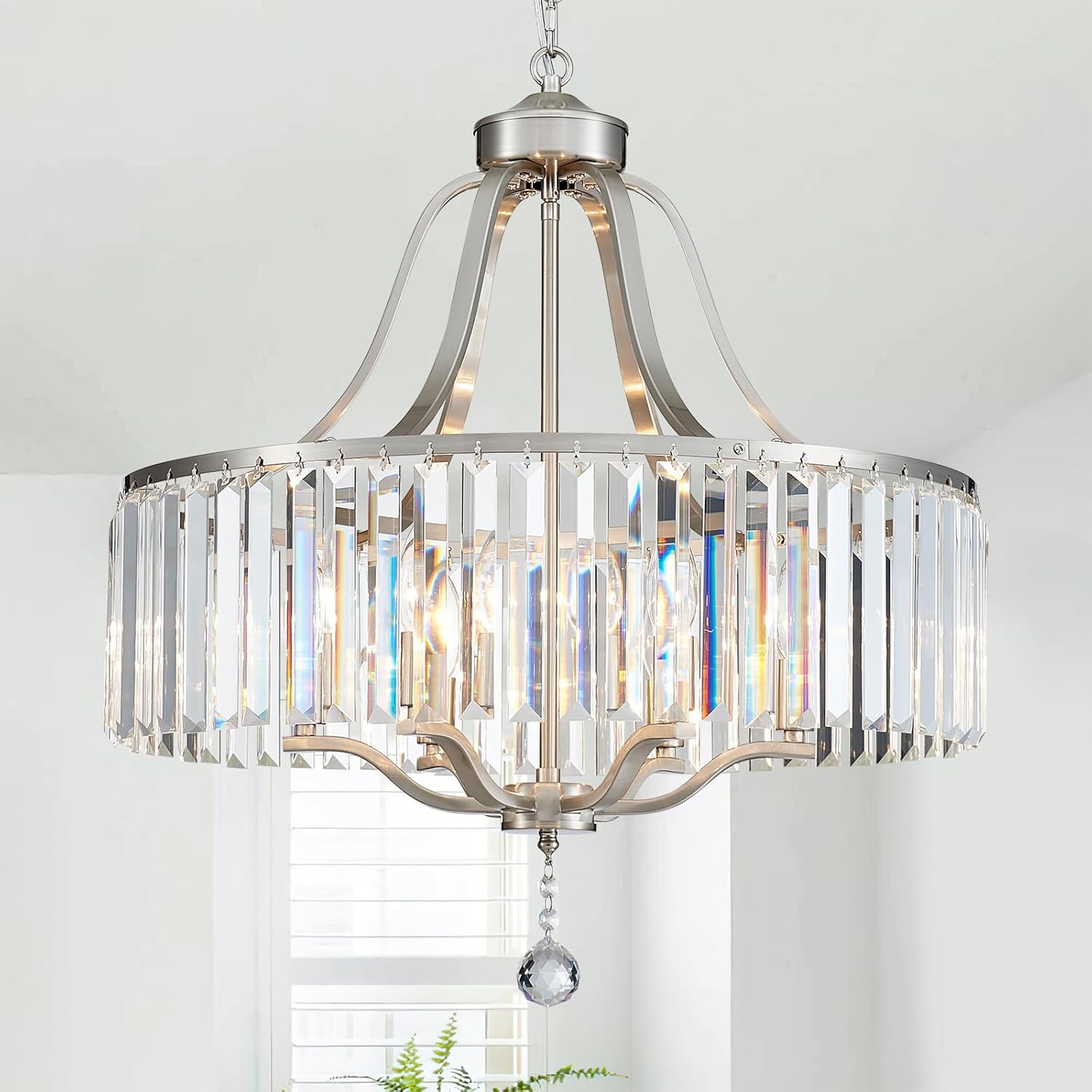 This stunning round chandelier requires assembly, which may take some patience as you'll need to assemble the metal frame and attach the crystal pendants. A clear installation manual and instructional videos are included to guide you through every step, and all necessary accessories for installation are provided. Measuring 12.2 x 12.2 x 13 inches, this 3-light chandelier features E12 sockets (maximum 40W per socket, bulbs not included) and is compatible with LED, CFL, halogen, and incandescent bulbs, allowing you to easily adjust the brightness for any occasion. The modern design showcases a durable brushed nickel frame adorned with beautiful crystal accents, making it a perfect centerpiece for various spaces such as kitchens, living rooms, and dining areas. With its elegant blend of crystal and metal, this chandelier enhances your home decor and reflects your personal style. For any questions or issues during or after your purchase, our customer support team is here to help, and we promise to respond within 24 hours for a smooth experience tailored to your expectations.