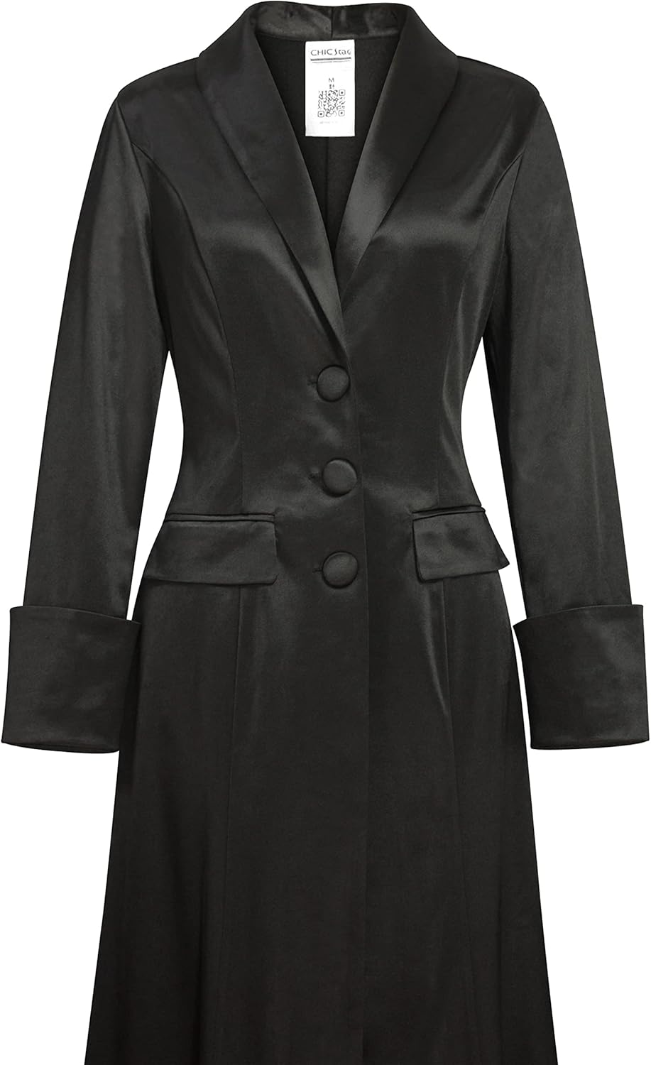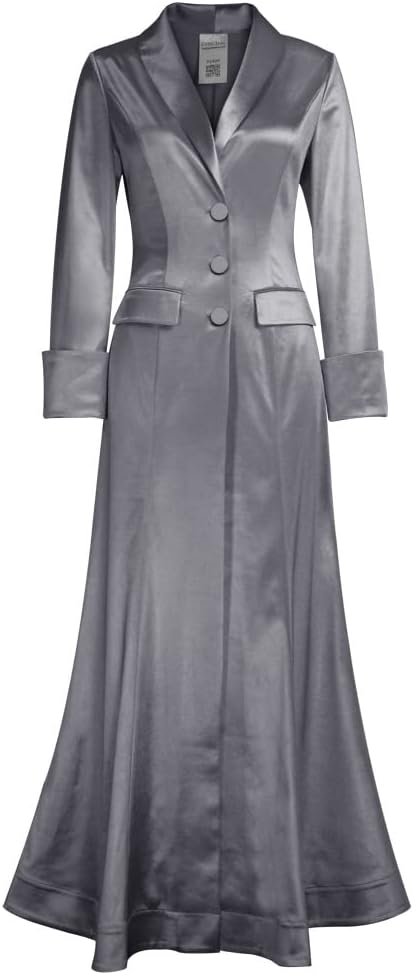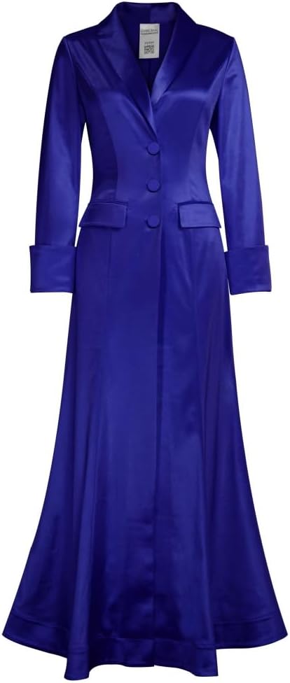 It's a long sleeve maxi dress coat made of knit satin fabric. Waist decorative pockets. Front buttons closure. Standard size approx. length: 54 inches; Plus size approx. length: 55 inches. MATERIAL: 88% POLYESTER 12% SPANDEX. CARE: DRY CLEAN WASH SEPARATELY DO NOT BLEACH DO NOT TUMBLE DRY LOW IRON.