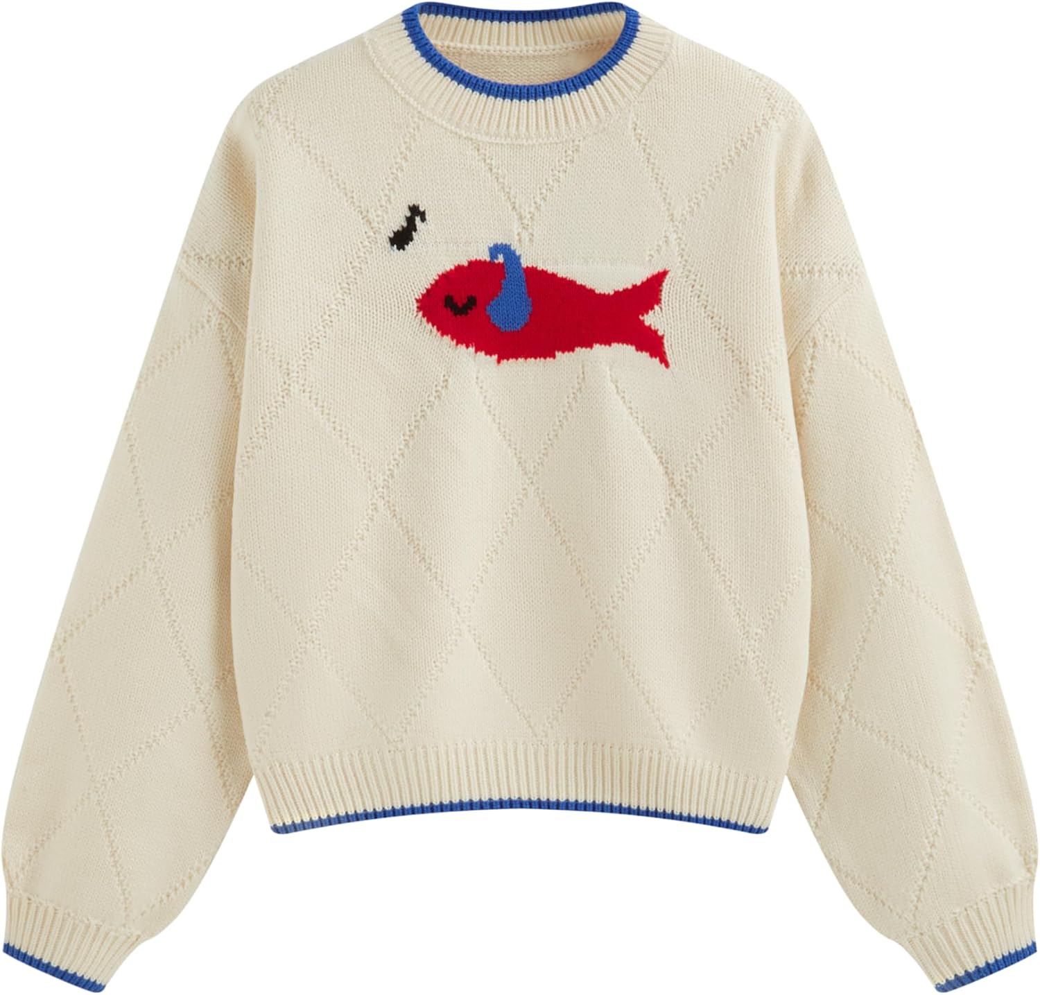 CIDER Knit Round Neckline Fish Graphic Contrasting Binding Oversized Top
