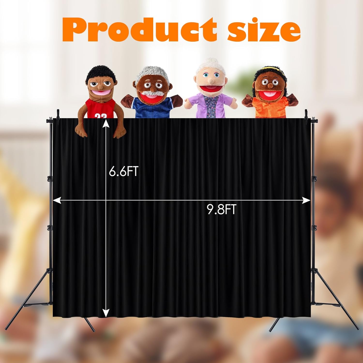 Product Description Professional Puppet Theater | Make Performances Freer This 6.6x9.8FT super-large puppet stage is designed for users who pursue professional performance effects. It is wider and taller than ordinary stages on the market, providing a wider performance space, making puppet manipulation more flexible and the audience's vision more immersive! Core Advantages [Quick Installation and Disassembly] - Adopting a "plug and play" tripod + long pole structure, no screws or tools are required, 10 seconds to lock, 3 minutes to complete the construction, saving 50% time compared to competing products! [Super Stability] - Thickened aluminum alloy bracket + non-slip foot pad, load-bearing 15kg, even if the performance is intense, it will not shake, safe and reliable. [Theater-level curtain] - Adopting 780g high-density blackout cloth, completely eliminate light transmission, with 4 large clips + 3 anti-fall small white clips, the curtain is flat and wrinkle-free. [Smart Storage System] – Exclusive long cloth bag + small classification bag, clip/bracket/curtain partition storage, say goodbye to the trouble of losing accessories! Size and accessories Stage size: 6.6FT (width) x 9.8FT (height) Tripod adjustment range: 2.6FT~6.3FT (suitable for performers of different heights) Accessories included: 2 extended aluminum alloy rods (rust-proof and scratch-proof) 2 tripods (with non-slip rubber feet) 1 6.6x9.8FT blackout curtain (black, other colors can be customized) 4 large clips (fixed curtain) + 3 small clips (auxiliary adjustment) + 3 anti-fall white clips 1 portable long cloth bag + 1 accessory storage bag Applicable scenarios School theater: children's puppet class, class performance Church activities: Bible story interpretation, holiday celebrations Family entertainment: parent-child interactive theater, birthday party performance Professional theater: portable for touring performances Precautions Adult assistance is required for installation (children please use under supervision). Puppets are not included (can be paired with various hand puppets/marionettes). The curtain is machine washable (cold water gentle cycle recommended).