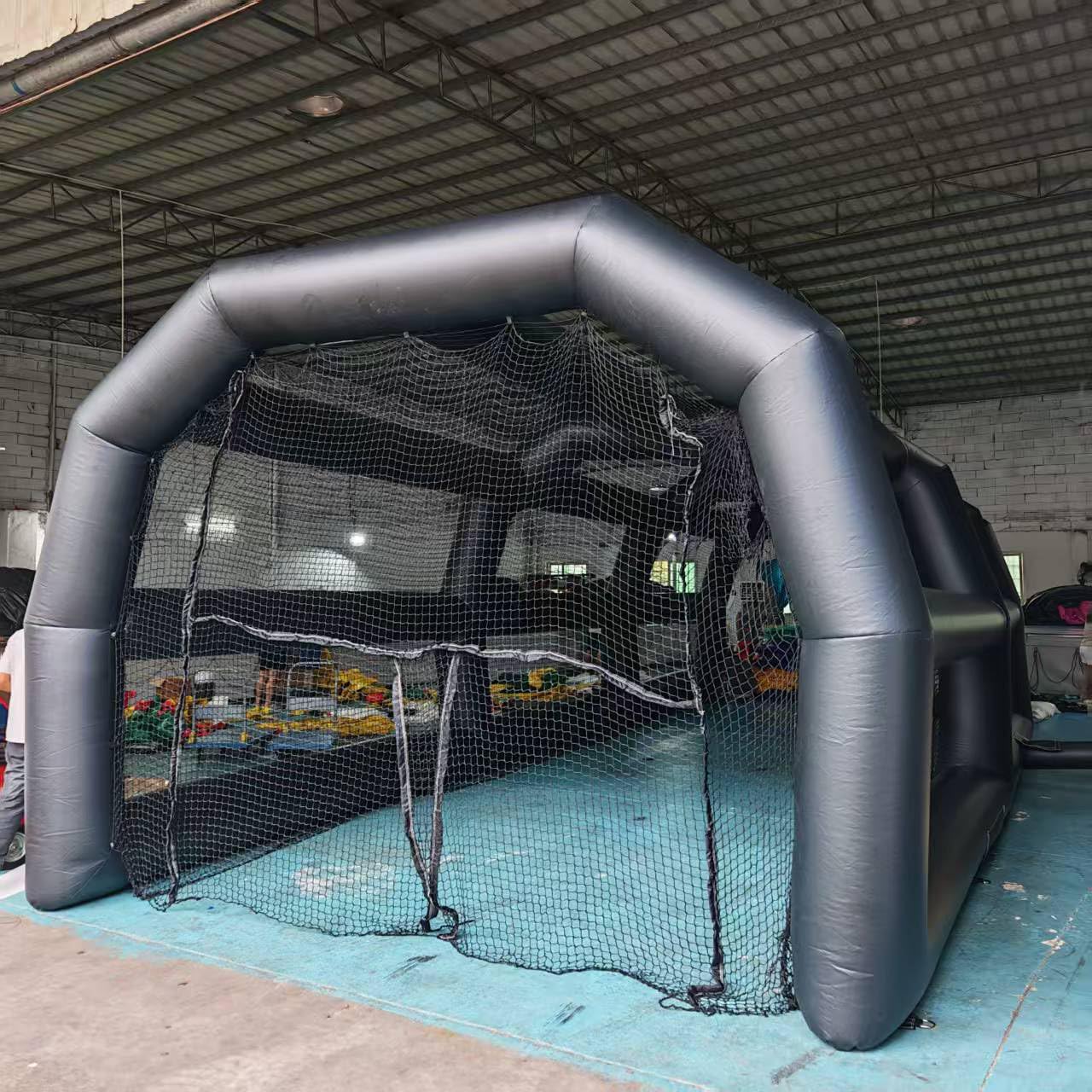 CAGE IS CONSTANT AIR AND WILL NEED BLOWER TO STAY ON TO KEEP INFLATED SIZE: 40' X 15' X 11' COMES IN A STOCK BLACK COLOR BUT CAN MAKE ANY COLOR (upcharge may apply) COMES WITH CAGE, BLOWER, AND CARRYING BAG MATERIAL: 0.65MM PVC