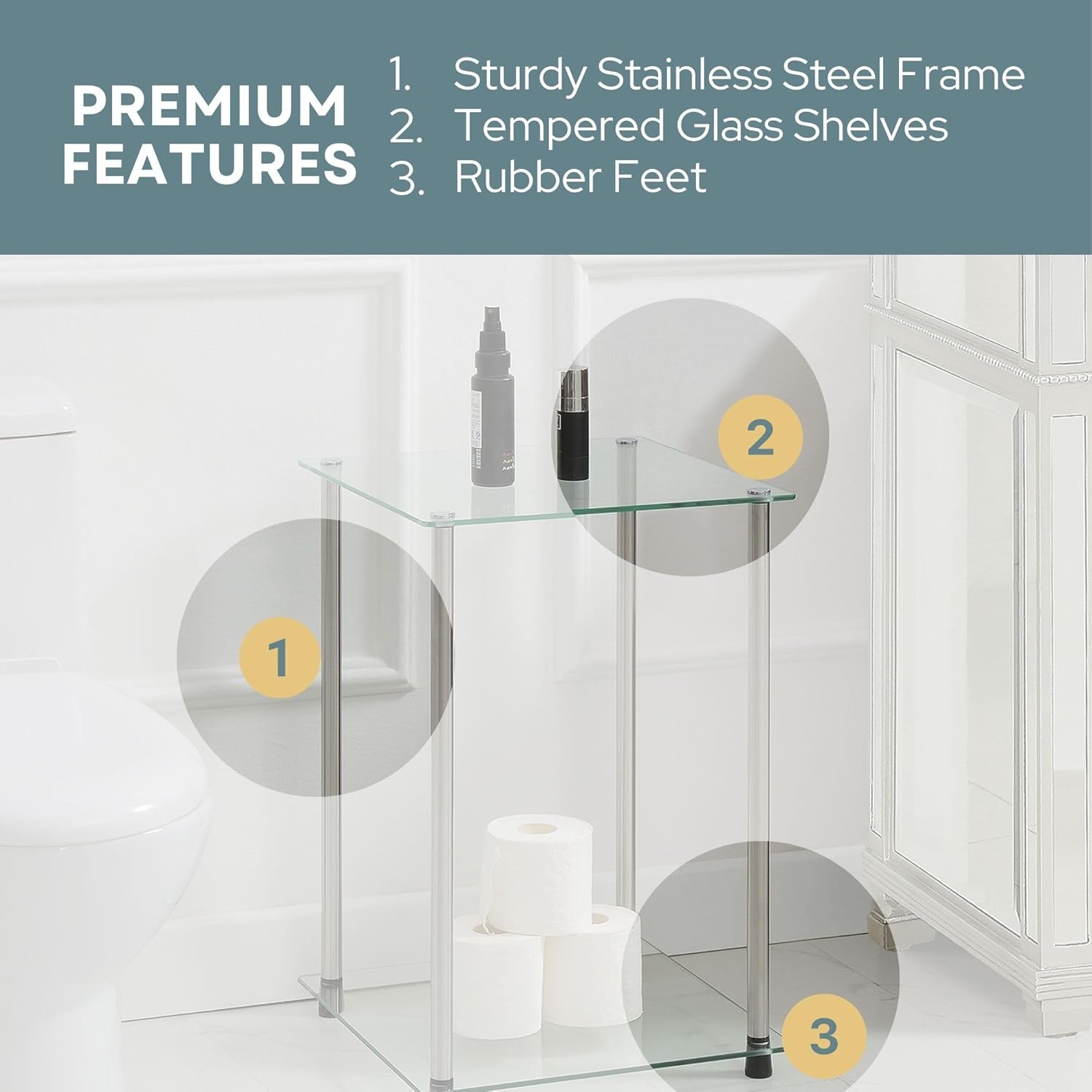 Add the flawless design of the Designs2Go Classic Glass 2 Tier Square End Table by Convenience Concepts to your home setup. This classic square design is the perfect piece to place next to a couch, loveseat, recliner, bed, or in the bathroom if additional storage is needed. Plenty of surface space is available to keep home essentials nearby or to display decorative home décor. Both shelves are made of clear tempered glass and the legs are made of sturdy rust-resistant stainless steel making this contemporary piece practically maintenance-free. In addition, rubber soles cover the bottom of each leg to help protect your floors. This luxurious side table can easily be assembled in minutes and requires no tools to put it together. Complete your modern home look with additional pieces from the Designs2Go Classic Glass Collection by Convenience Concepts, each sold separately.