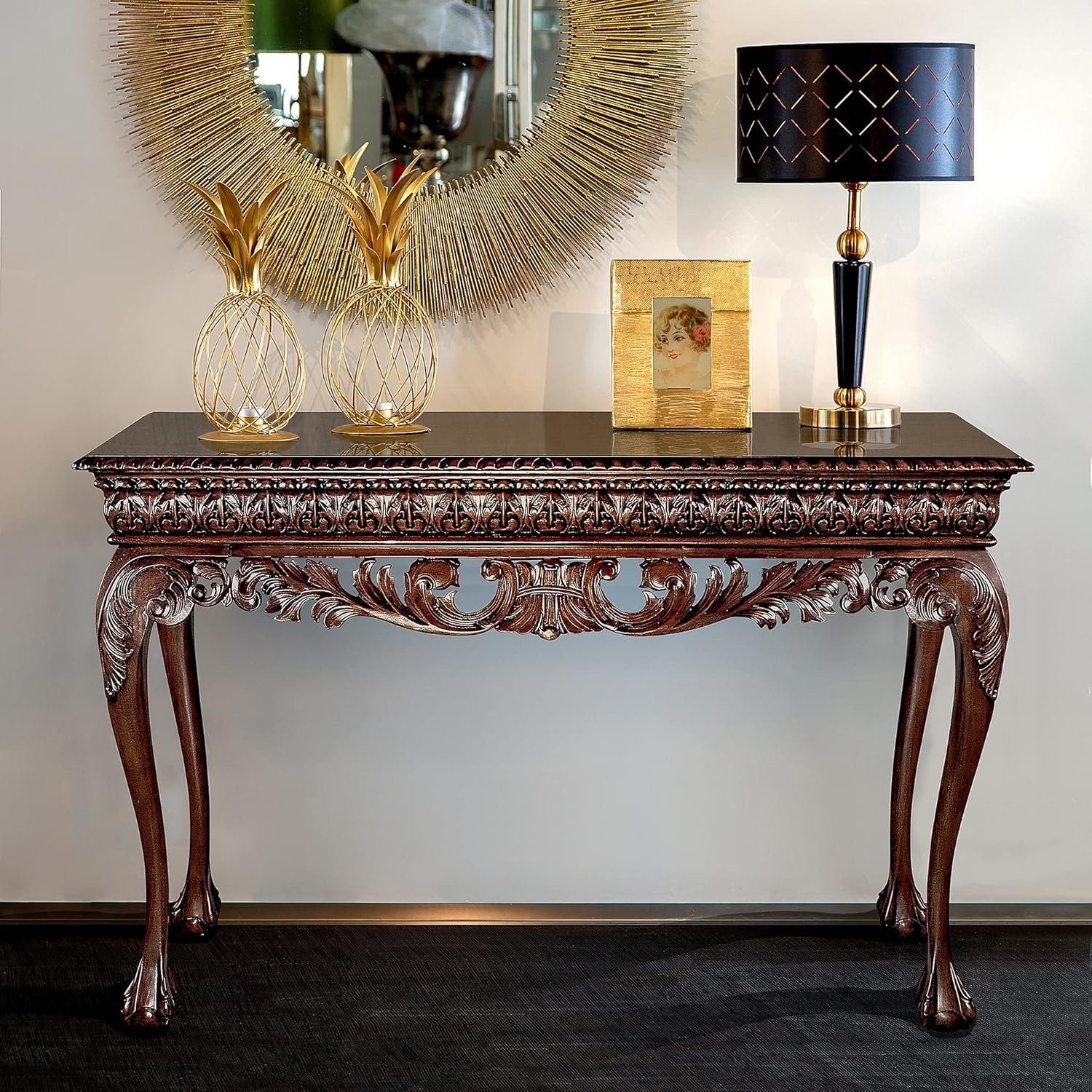 Originally created at over a yd. tall & 5' Long for a grand French palace, This estate-sized console is not for an ordinary home! Since it's almost impossible to find an antique of this size & scale, we have our master carvers spending an entire week to craft this solid mahogany work of furniture art. Resplendent with acanthus scrolls & Intricate claw & ball', Our exclusive is a stunning signature piece for your most impressive room. 60"Wx20"dx40"h. 57 lbs.
