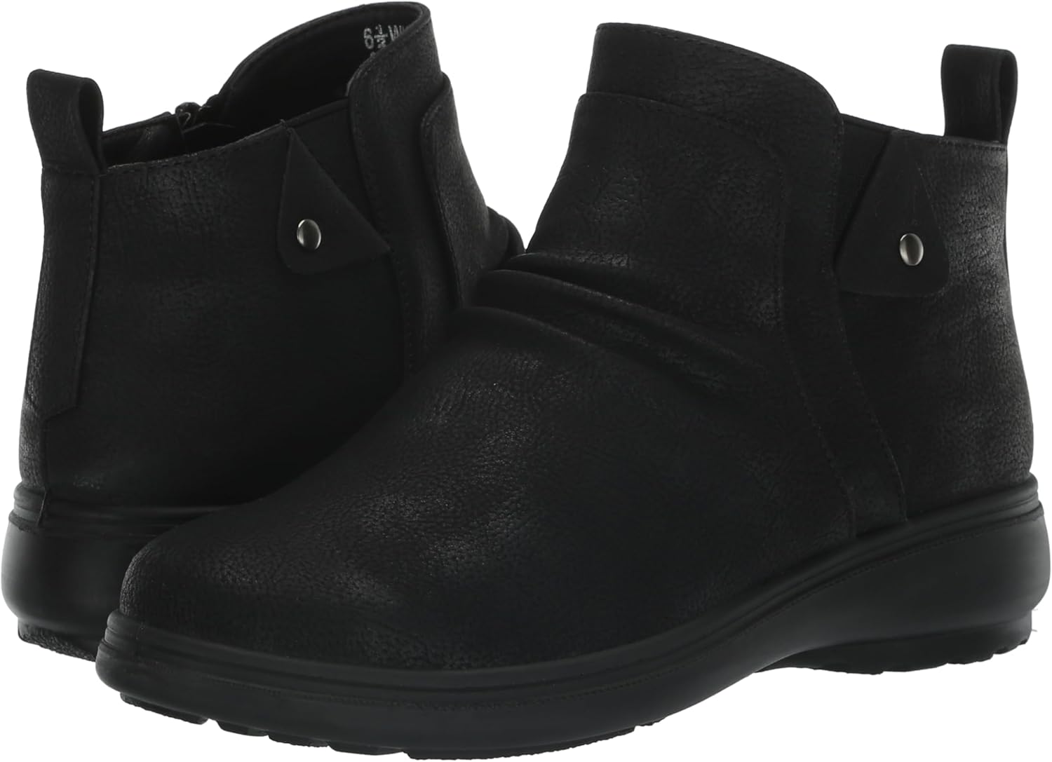 Easy Street Ariadne is your everyday go-to bootie. Casual yet contemporary in design, the rusching and nail head details, freshen up this everyday bootie. Designed on a Comfort Wave unit outsole that is both lightweight and flexible. The stretch-for-fit features and an Easy Motion by Easy Street insole provide all-day comfort. An inside zipper for easy on/off.