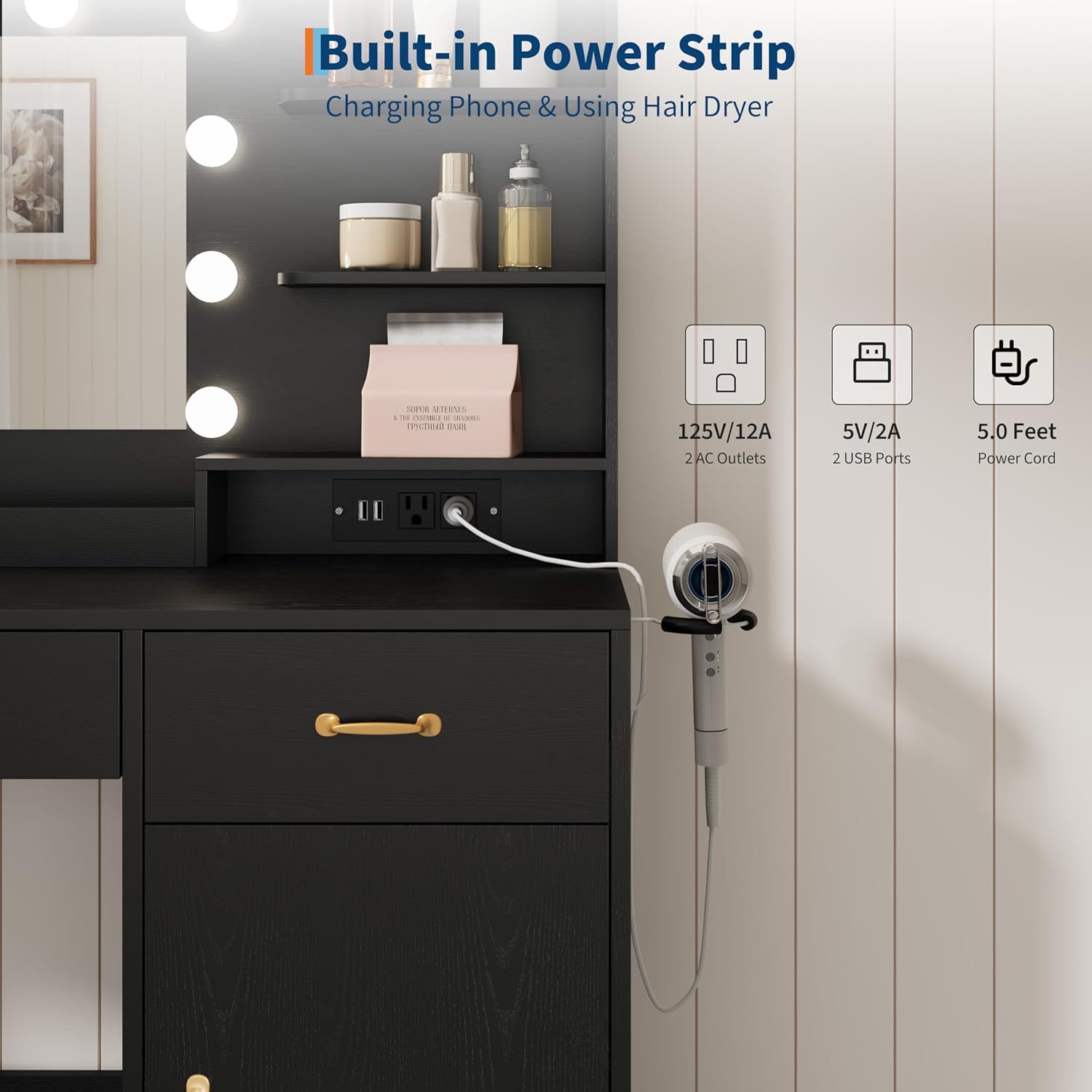 • 【Makeup Vanity with Storage & Triple-Drawer Dressing Table】:Maximize organization with this makeup vanity with drawers. It integrates a triple-drawer beauty organizer, including a partitioned jewelry organizer for brushes and gems, plus two expansive drawers. The side organizer with adjustable shelves (14.4"W x 13.9"D) serves as a skincare storage center, effectively decluttering your black dressing table and keeping essentials within reach
