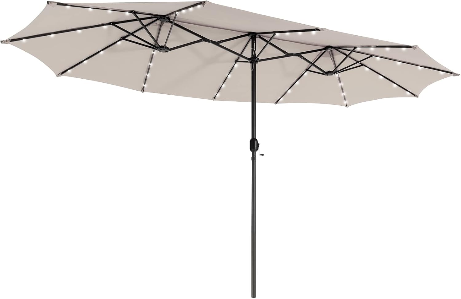 Description: Do you need a large sun shelter to spend tea time with friends in garden? Our double-sided patio umbrella brings both visual decoration and daily practicality to home, outdoor market and cafe. Extra-large canopy provides spacious shady space for a set of outdoor furniture. 12-rib metal structure ensures excellent sturdiness and lasting durability. With 48 solar LED lights on the ribs, this durable patio umbrella will bring charming brightness to night garden, and there is a design to place standby battery for extra power supply. What’s more, the convenient hand-crank system is specially designed for effortlessly opening and closing. Besides, it is ultra-easy to assemble the umbrella by following the instruction. Please notice that the outdoor twin umbrella should be used with a weighted base, which is sold separately. Features: Double-sided canopy with air vents offer shady relaxing place Premium polyester fabric effectively blocks up sunlight 12-rib metal structure ensures high durability and sturdiness 48 solar LED lights provide brightness at night Easy-to-operate hand crank mechanism facilitates opening closing Ideal for residential and commercial occasions to use A weighted base (sold separately) is necessarily needed for patio umbrella stably placing Specification: Color: Beige, Burgundy, Coffee, Navy, Orange Material: Steel, Polyester Fabric Overall Dimension: 15.4ft x 9.2ft x 8ft (L x W x H) Pole Diameter: 1.9'' Net Weight: 26 lbs Package Includes: 1 x Patio Umbrella 1 x User’s Instruction