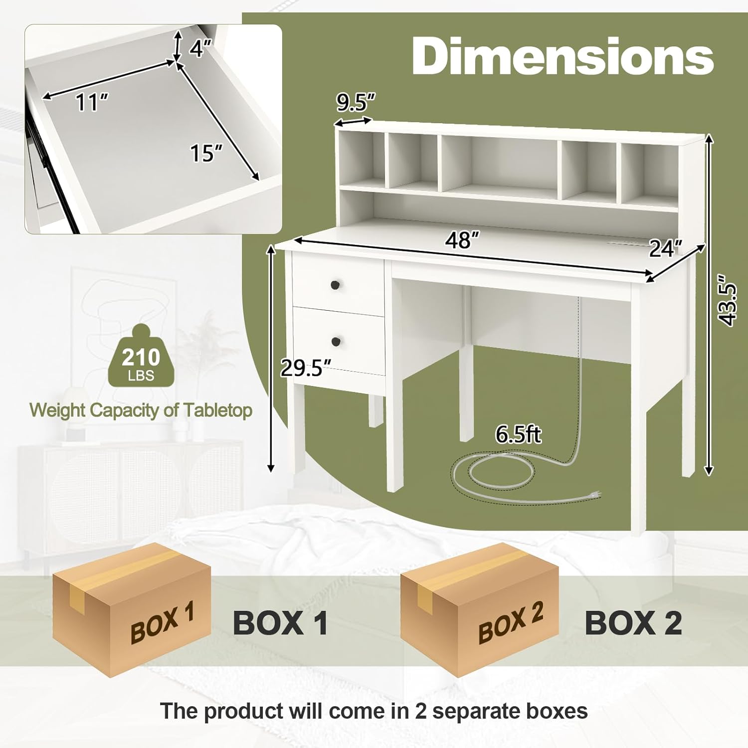 Description:Introducing the ultimate computer desk, designed for the modern workspace.Say goodbye to tangled cords, thanks to its innovative charging system featuring 2 AC outlets & 2 USB ports. No more messy extension cords cluttering your desk. Stay organized with ample storage space, including a 48” tabletop & 2 pull-out drawers. Your books, papers & supplies will finally have a designated place, eliminating chaos. But that’s not all - the desk comes with a 5-cube hutch, perfect for storing stationery items while showcasing your decorative treasures. Customize the organization with its divided cubes. Crafted with strong boards & supported by 6 sturdy legs, this home office desk is built to last. Don’t worry about stability - it’s fitted with anti-slip foot pads. Follow the clear manual provided for a hassle-free installation. Elevate your workspace with style & functionality.Features:Wide tabletop offers roomy space for working, learning, gaming or writing5-cube hutch to provide large storage & keep items well organizedComes with 2 pull-out drawers to offer private space for important documentsCrafted of superior materials to ensure perfect sturdiness & durabilityFitted with metal drawer slides to achieve smooth & easy pullingFeatures protection foot pads to keep the floor away from scratchesWorks well in the living room, study, bedroom, and moreHassle-free installation with an easy-to-understand manualSpecifications:Color: WhiteMaterial: Engineered Wood, MDFOverall Dimensions: 48” x 24” x 43.5”/120 x 60 x 110 cm (L x W x H)Tabletop Height: 29.5”/75 cmTabletop Shelf Width: 9.5”/24 cmInterior of Drawer: 15” x 11” x 4”/38 x 28 x 10.5 cm (W x D x H)AC Outlet: 125V/12AUSB Port: 5V/2APower Cord Length: 6.5 ft/2 mWeight Capacity of Tabletop: 210 lbs/95 kgNet Weight: 96 lbs/43.5 kgPackage Includes:1 x Computer Desk1 x Instruction