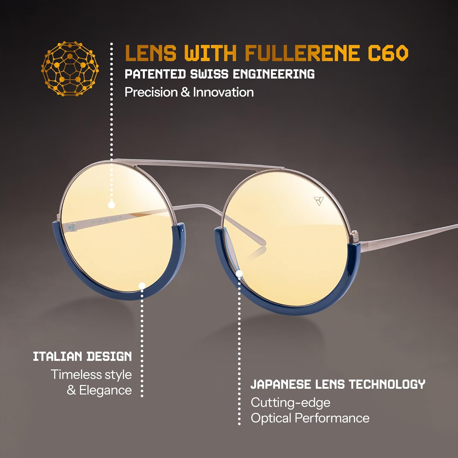 Zepter Hyperlight round frames Hyperlight Optics' transforms light to enhance wellbeing and visual performance, optimizing your body's balance in any environment. Hyperlight Optics' revolutionary Fullerene C60 lens technology transforms light to enhance wellbeing and visual performance, optimizing your body's balance in any environment. Protect your eyes, optimize brain function, and improve your mood with Hyperlight Optics. Designed with the special Fullerene C60 lens to transform harmful wavelengths into a more beneficial light, that corresponds precisely to the eye sensitivity spectrum. Hyperlight Optics is suited for both indoor and outdoor wear, providing clear vision and comfort in any environment. Hyperlight Optics are unique because of the special nanophotonic materials used in their production, which transform ordinary, diffused light into a new light that is considerably more compatible with our biomolecules. It means that a photon interacts with Fullerene C60 to form an exciton. The photon and the exciton couple together and eventually combine, to form a polariton. The energy particles of previous photons in the polariton are ordered following the laws of the electromagnetism of biomolecules, both in our eyes and in our brain. For this reason, they have an impact on the entire neuroendocrine system. This contributes to better body regulation, thus placing Hyperlight Optics as a unique, leading brand in the sunglasses and blue-light blockers market. 1. The protective layer is on both sides of the lens. 2. Hydro and oleophobic coating: protects against scratching and facilitates cleaning and has an antistatic component that repels dust particles from both sides of the lens. 3. Patented 8 layers of ion coatings: following the Ioncoat K+ process, eight layers of material with different index levels are vacuum applied to the lenses. Ioncoat K+ reduces light reflection to less than 1%, resulting in better vision. 4. Optimizing the Hard layer (HC): specially matched with the anti-reflection process and the superhydrophobic layer, it extends the life of the anti-reflection layer and provides additional protection against scratches.; 5. Fullerene layer on both sides of the lens. 6. CR 39 lenses.