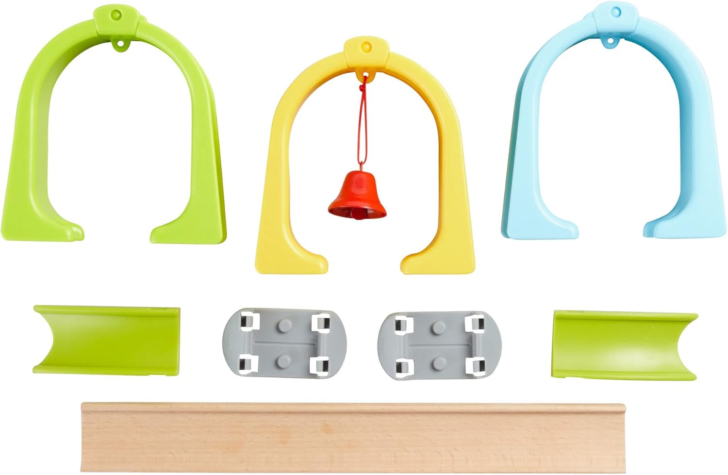 The ball runs almost silently through the tunnel until it hits the red bell and generates a cheerful ring making this a surprising acoustic experience. Nest all three bridges right next to each other or spread them out!