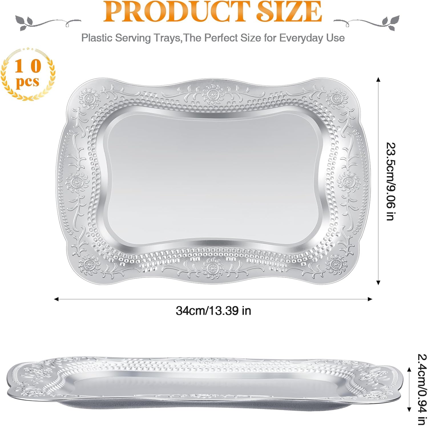 Features: Elegant silver color: Radiate elegance with our bright silver colored serving platter, setting your events apart. The vibrant color brings sophistication to your table, enhancing your dining experience. Whether applied for special occasions or regular meals, our silver serving trays make every serving moment memorable. Ideal gift: Our silver serving dishes make for an ideal gift due to their universal utility and striking aesthetics. Given their ample quantity and the beauty they bring to any dining setting, these trays are a choice for housewarming, wedding, or bridal shower gifts. Specifications: Material: polystyrene plasticColor: silver Size: about 13 x 9 x 0.8 inches/ 34 x 23.5 x 2 cmPackage includes: 10 x silver serving tray Notes: Manual measurement, please allow slight errors on size. The color may exist a slight difference due to different screen displays. Not microwaveable, proper for serving cold, room temperature or slightly warm foods, hot food not allowed.