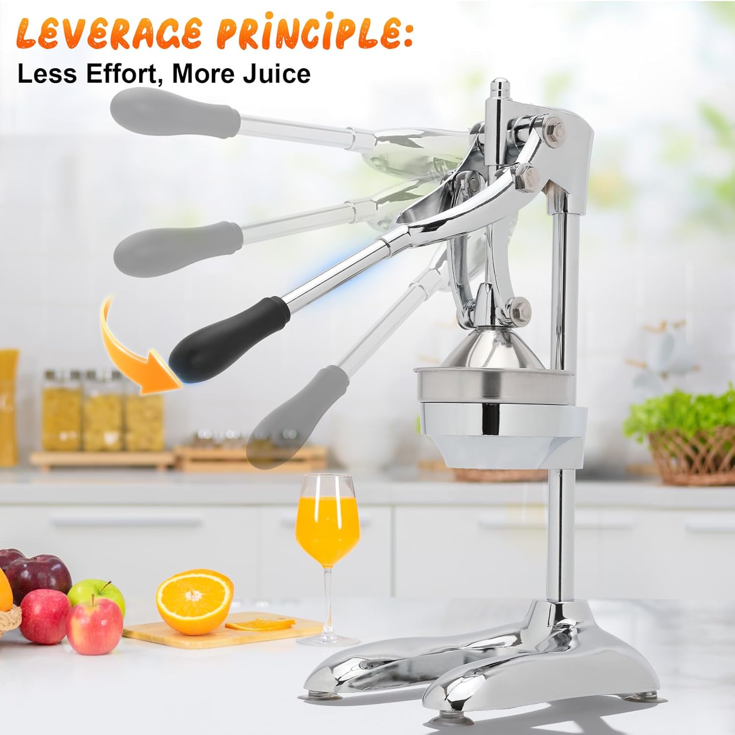 Still struggling with the hassle and power consumption of electric juicers? This manual juicer solves your pain points! The extended handle leverages mechanical principles, requiring minimal effort for effortless operation. Simply pull and press to extract juice from oranges, lemons, pomegranates, watermelons... in seconds. Enjoy fresh-squeezed juice anytime, anywhere—perfect for seniors and women alike. The 360° conical press combined with a large-capacity bowl ensures every last drop of juice is extracted. Seeds and pulp separate effortlessly, maximizing juice yield—saving you money while delivering pure, fresh nutrition. Food-grade 304 stainless steel touches your ingredients. A heavy-duty metal frame and non-slip base make it reliable for home, commercial use, or camping—durable and safe. All contact parts require no disassembly—just rinse or toss in the dishwasher. The included cleaning brush tackles hard-to-reach spots, making maintenance 100 times easier than electric models! Plus, enjoy a 2-year free warranty + lifetime online support with 24/7 response—fresh-squeezed living without worries!