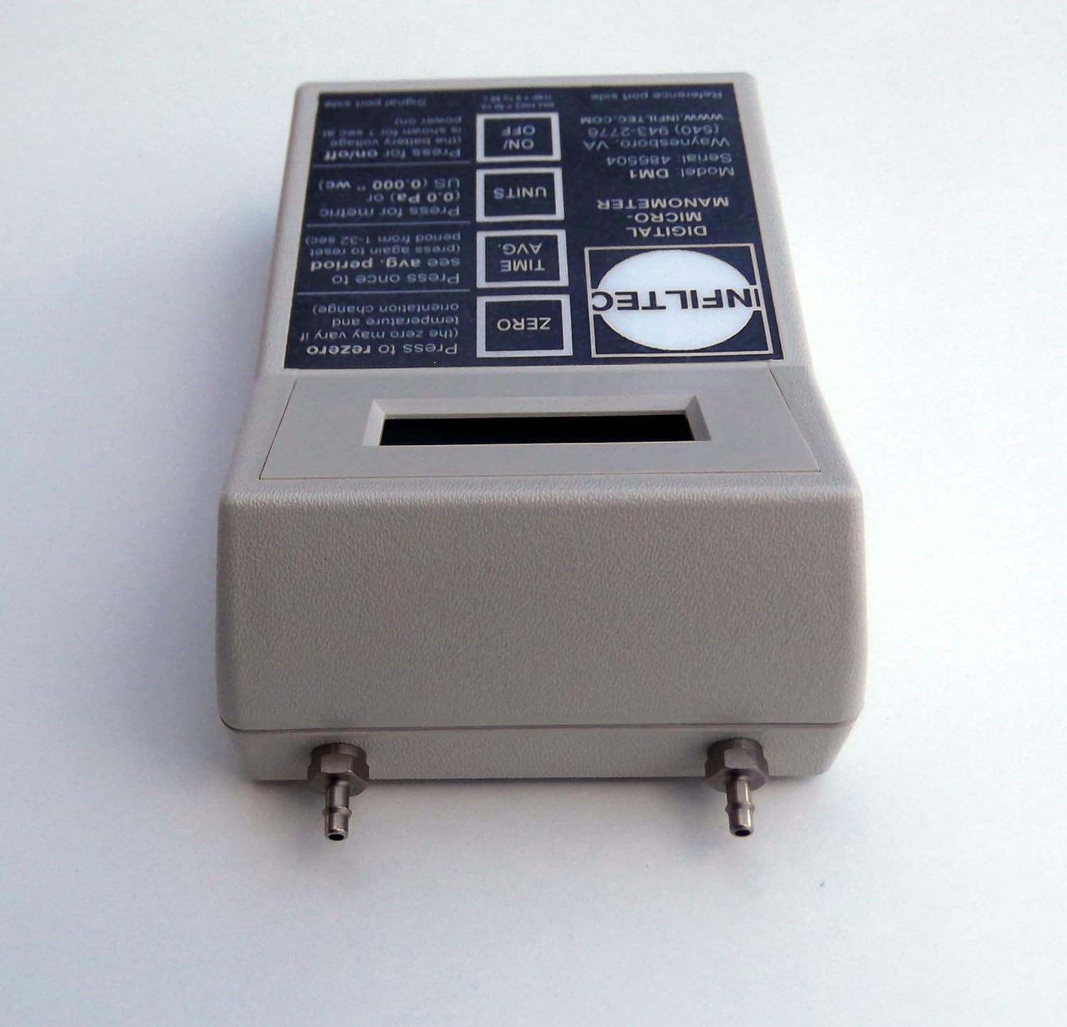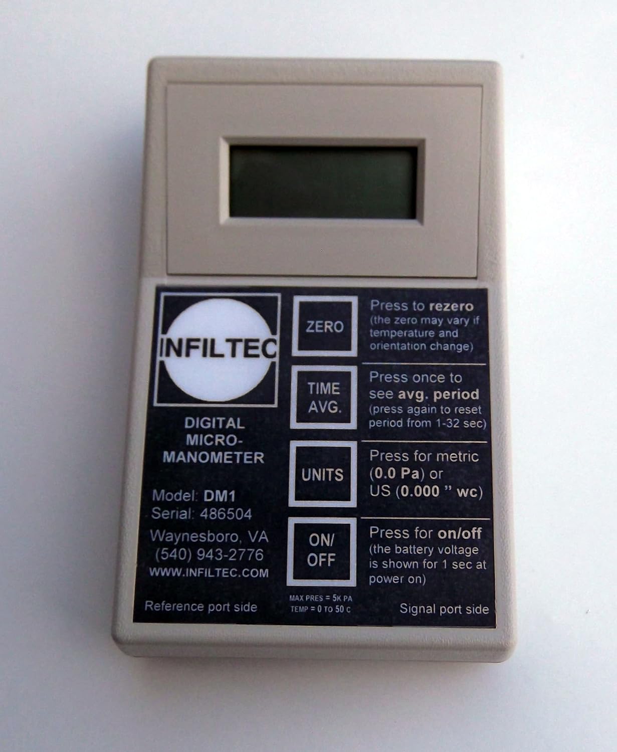The Infiltec Model DM1 micro-manometer is a portable digital micro-manometer with the easy-to-use 0.001 inch water column or 0.1 Pascal digital resolution units that can solve your toughest differential pressure measurement problems. Applications include HVAC test and balance, radon mitigation, furnace draft analysis, duct leakage testing, pressure balancing, combustion safety analysis, advanced building diagnostics, laboratory safety monitoring, clean room monitoring, isolation room monitoring, process monitoring, filter condition checks, environmental assessments, and Pitot or orifice pressure measurements. Comes in padded carrying case with 9v battery, extension tubing, manual, and calibration certificate.