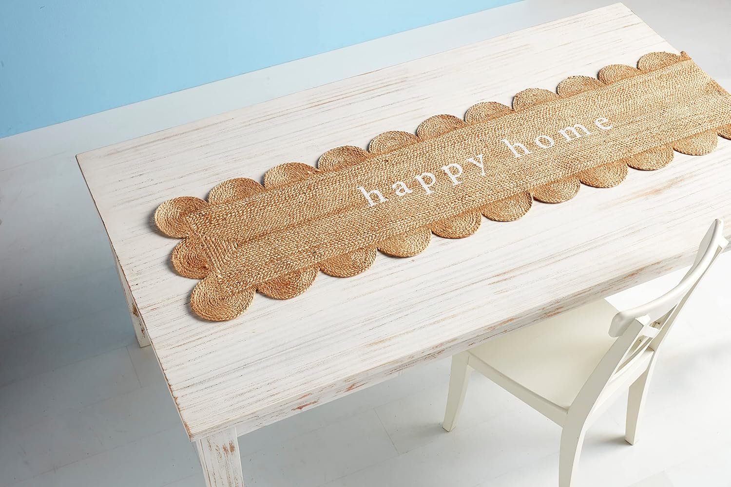 • The scalloped jute table runner reads " happy home" in the center.