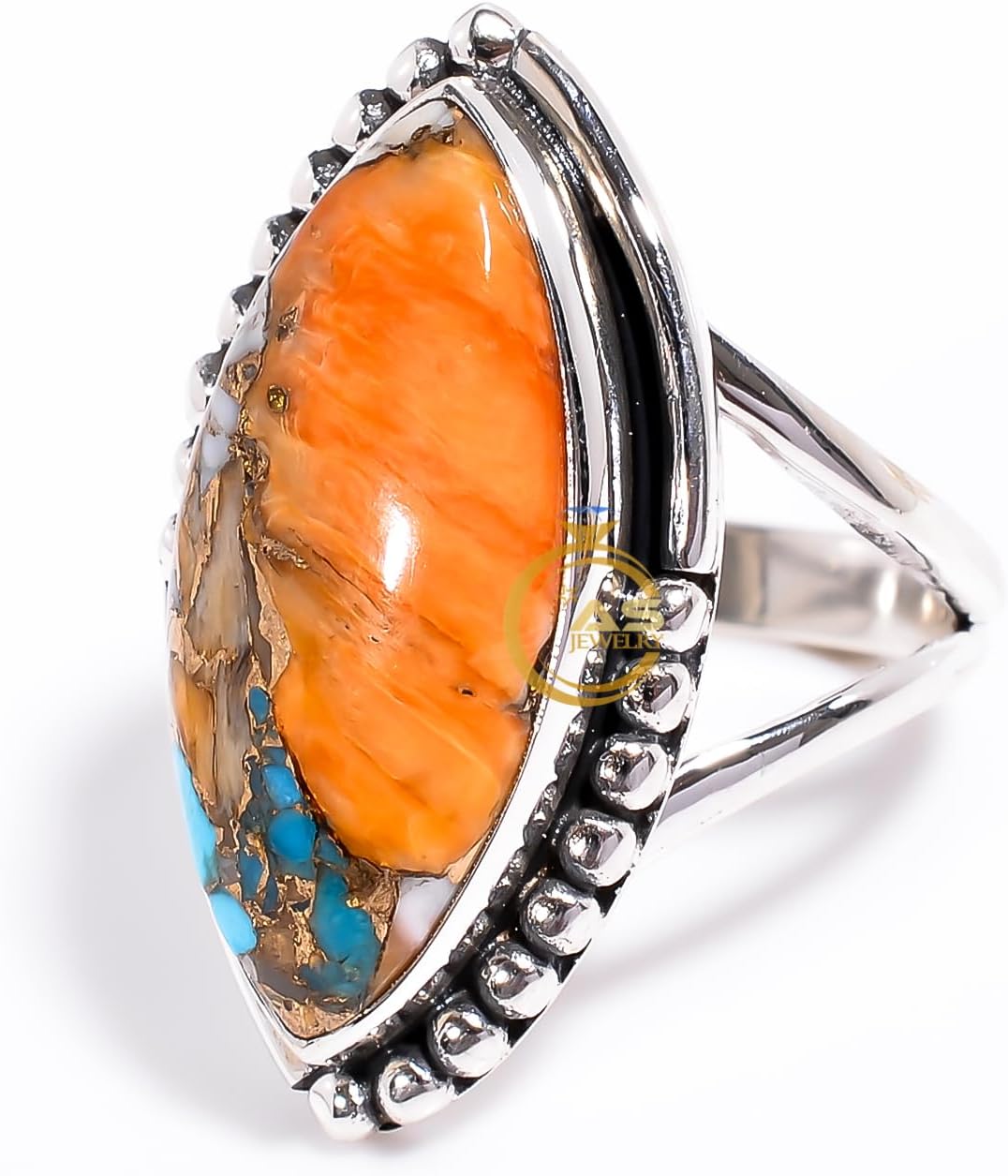 This handcrafted ring showcases a natural orange oyster turquoise stone, known for its vibrant fusion of fiery orange tones and turquoise accents. The stone's unique patterns are beautifully framed in 925 sterling silver, emphasizing its organic beauty and dynamic colors. The artisanal silver setting adds a touch of sophistication, enhancing the ring's appeal while maintaining a connection to its natural origins. Perfect for making a statement, this ring blends bold design with the charm of nature’s artistry, making it a standout addition to any jewelry collection.》Product Details:- Product - Ring Metal - Pure 925 Sterling Silver Stamp - 925 Gemstone – Orange Oyster Turquoise Gemstone Color – As seen in the picture (May some vary in color and pattern) Gemstone Treatment- No Treatment (Natural) Product Weight – 6.80gm Approximate 》About Product:- Our products are completely handmade and made of pure 925 sterling silver and natural gemstones, so don't worry about the quality, 100% customer satisfaction guaranteed. 》Please Note:- Because it is a natural gemstone, some slight variations in color and pattern are expected. 》Thank you for visiting my shop!