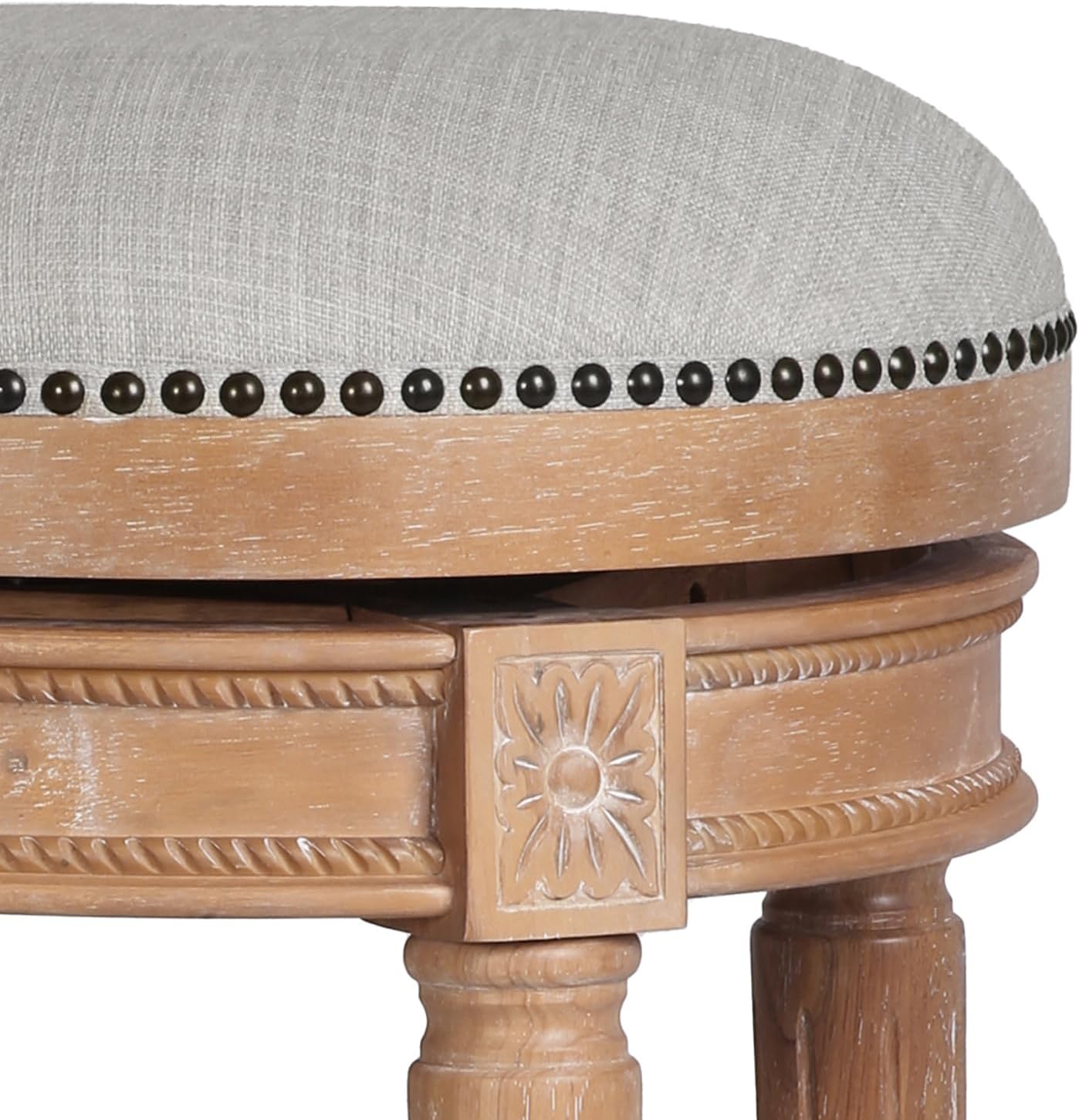 Bring a touch of comfortable sophistication to your dining area or recreation room with our backless barstool. With your choice of leg-height included for assembly, our 31in. bar-height stool or 26in. counter-height stool features 360-degree swivel, metal footrests, and hand-applied nail heads to add to the design. Features a Weathered Natural wood finish with a Gray upholstered seat.Features:- 360 degree swivel seat- Metal plate on footrest protects the wood- Frame color is Weathered Natural; seat is upholstered in Gray Linen Fabric- A few easy assembly steps- Available in bar and counter height- Premium upholstery and solid wood construction for durabilitySpecifications:- Frame Material: Rubberwood- Product Weight: 33- Seat Height: 31- Product Dimensions: 19in. W x 19in. D x 31in. H- Product Color: Weathered Natural