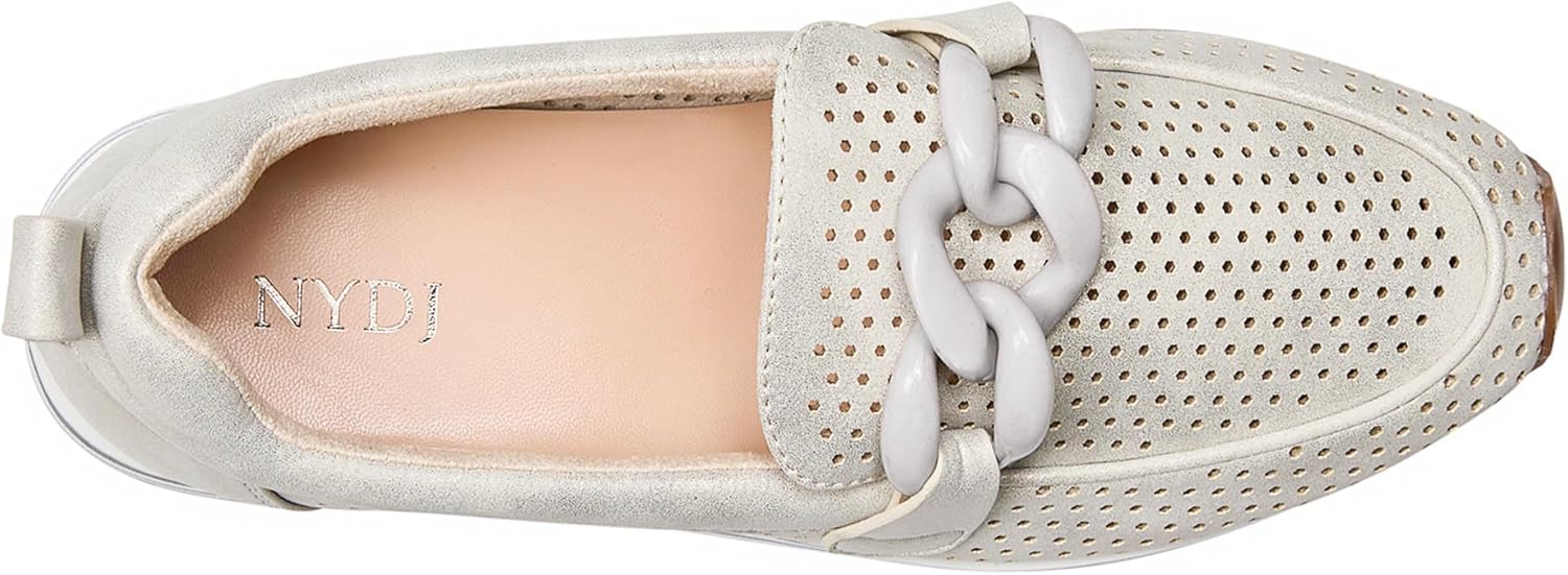 The Fern Platform Loafers by NYDJ are set on a sport bottom, making them a fun take on hybrid footwear. An ultra-soft, perforated faux suede upper keeps the design light, airy and breathable, while a padded platform offers height and style. This slip-on features a memory foam padded insole and a lightweight EVA foam midsole ensure walking-on-air comfort all day long. Finished with a matching chain ornament, a padded topline and rubber sole