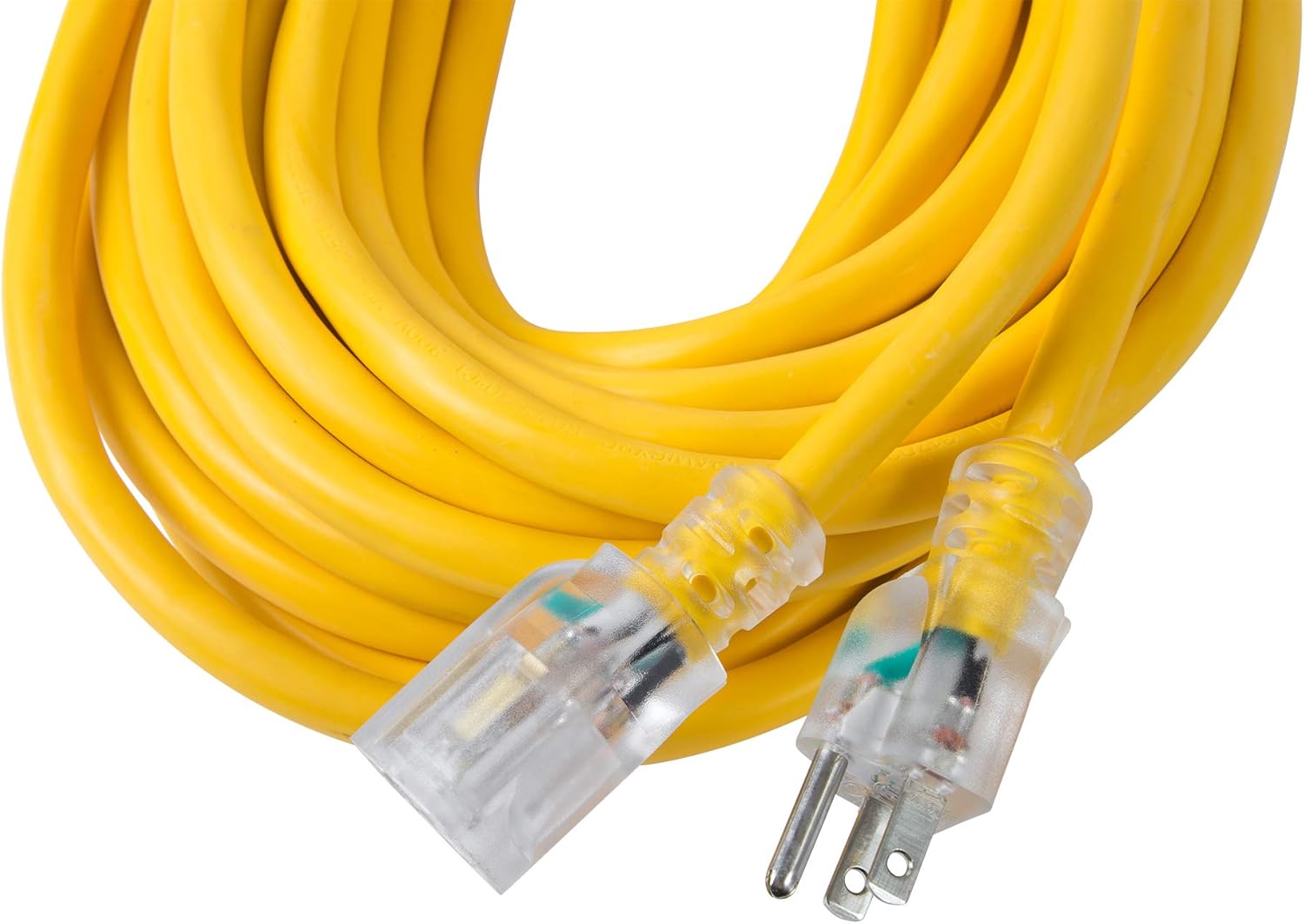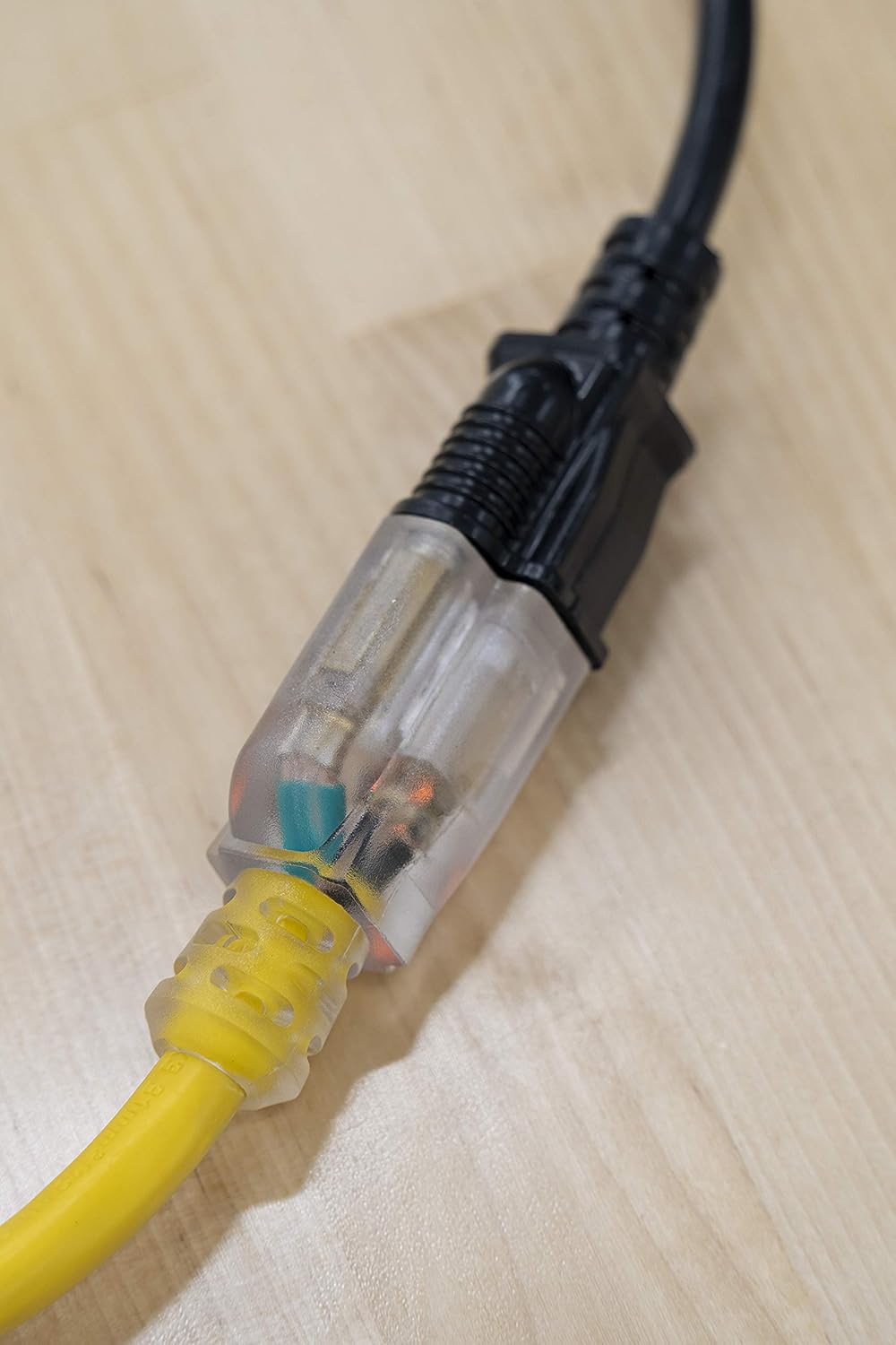 Heavy duty, super flexible extension cord is manufactured to withstand everyday use on jobsites. Molded plug and connector ends with a high visibility yellow SJTW jacket provides both weather and UV resistance for longer life. 12/3 AWG cable reduces voltage drop while the lighted connector end indicates the presence of voltage. ETL approved for outdoor use.