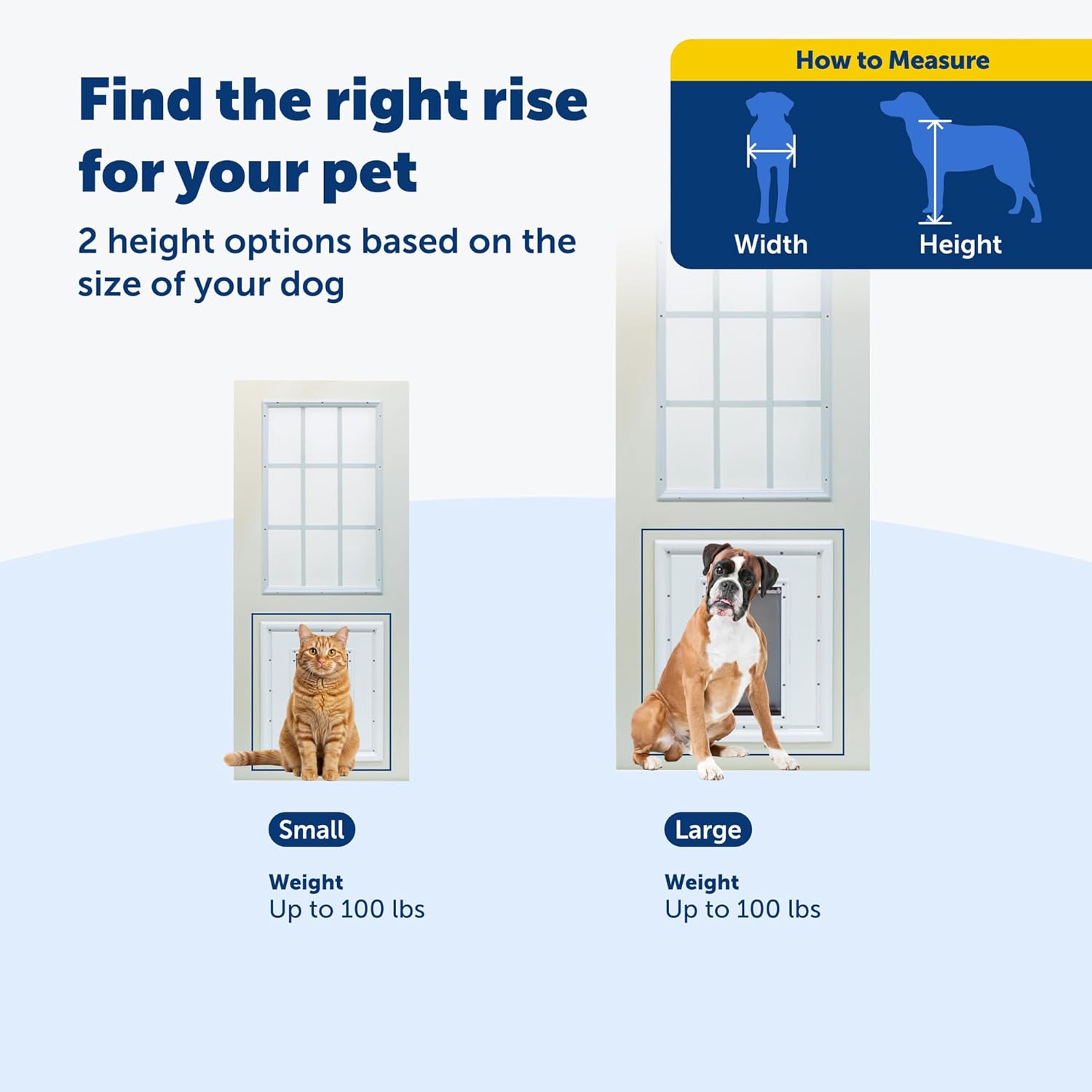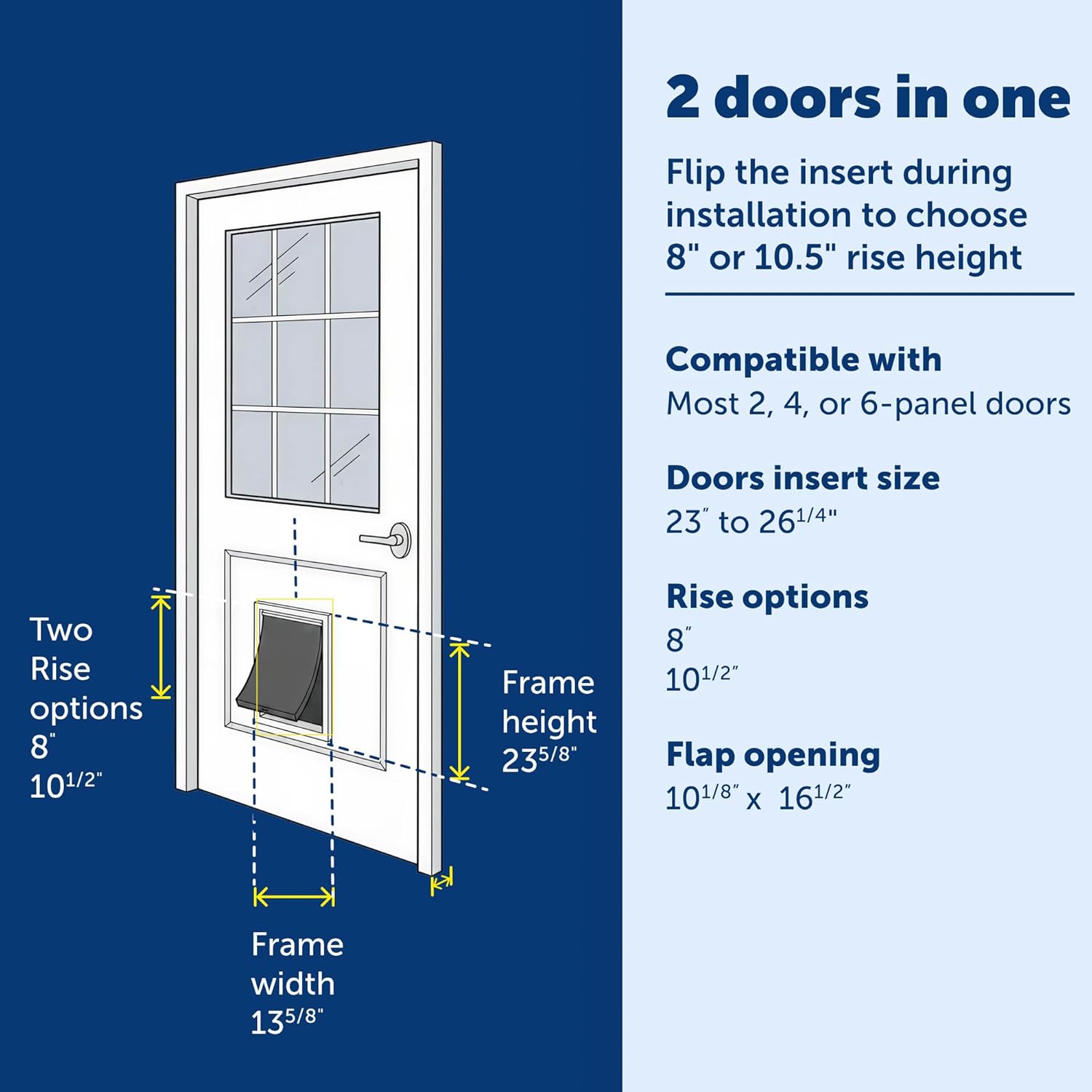 Give your pet the freedom they deserve without sacrificing the style of your home. The PetSafe Panel Pet Door Insert is the perfect solution for paneled doors, providing a convenient and attractive way for your pet to go in and out. Whether you need a new pet door or want to replace an old one, this insert is designed to complement most standard 2-panel, 4-panel, and 6-panel doors. Its paintable surface makes it easy to customize the look so it blends seamlessly with your home decor. The Panel Pet Door Insert is built for durability and performance. Made from weatherproof materials, it's built to last. The dual-flap design features adjustable magnets that create a secure seal to reduce drafts and protect your home from outdoor elements. Two rise options (8 inches or 10 1/2 inches) allow you to install the door at a height that's right for your pet, giving your furry friend safe and easy access to the outdoors. The snap-on closing panel lets you control when your pet can go outside, and the inner and outer frame with pre-applied sealant creates a professional, polished look. This pet door insert is perfect for families looking for a durable, functional, and stylish solution to give their pets the independence they need. Since 1988, PetSafe has been driven by a simple belief: safe, healthy pets lead to happier lives for pets and their families. For over 25 years, we've been dedicated to enhancing the lives of pets and the people who love them, treating every pet as a cherished family member and delivering life-changing innovations designed to enrich every moment. With U.S. roots and a global reach, our vet- and trainer-recommended products are built for every pet and backed by exceptional customer support. From backyards to dog parks, we're on a mission to create fields of joy for happy, healthy, and safe pets.
