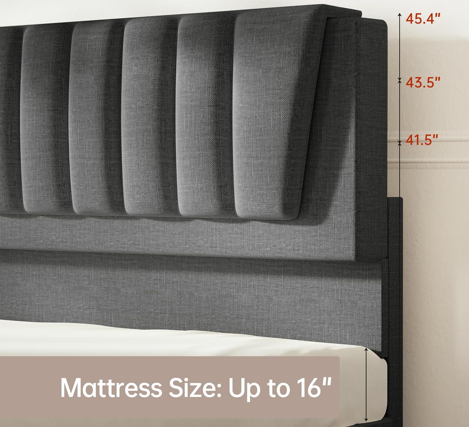 • Adjustable Upholstered Headboard for Everyday Comfort: The soft bed frame includes a height-adjustable upholstered headboard to accommodate different mattress thicknesses and sitting preferences. The ergonomic angle provides comfortable back support for reading, watching videos, or relaxing in bed—without compromising the overall balance and appearance of the bed