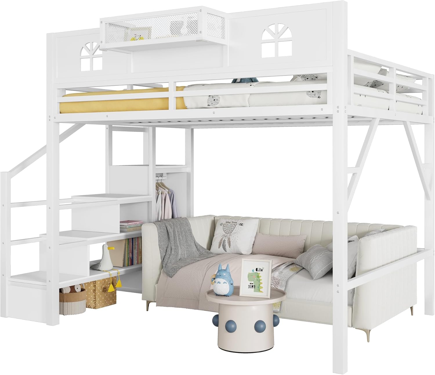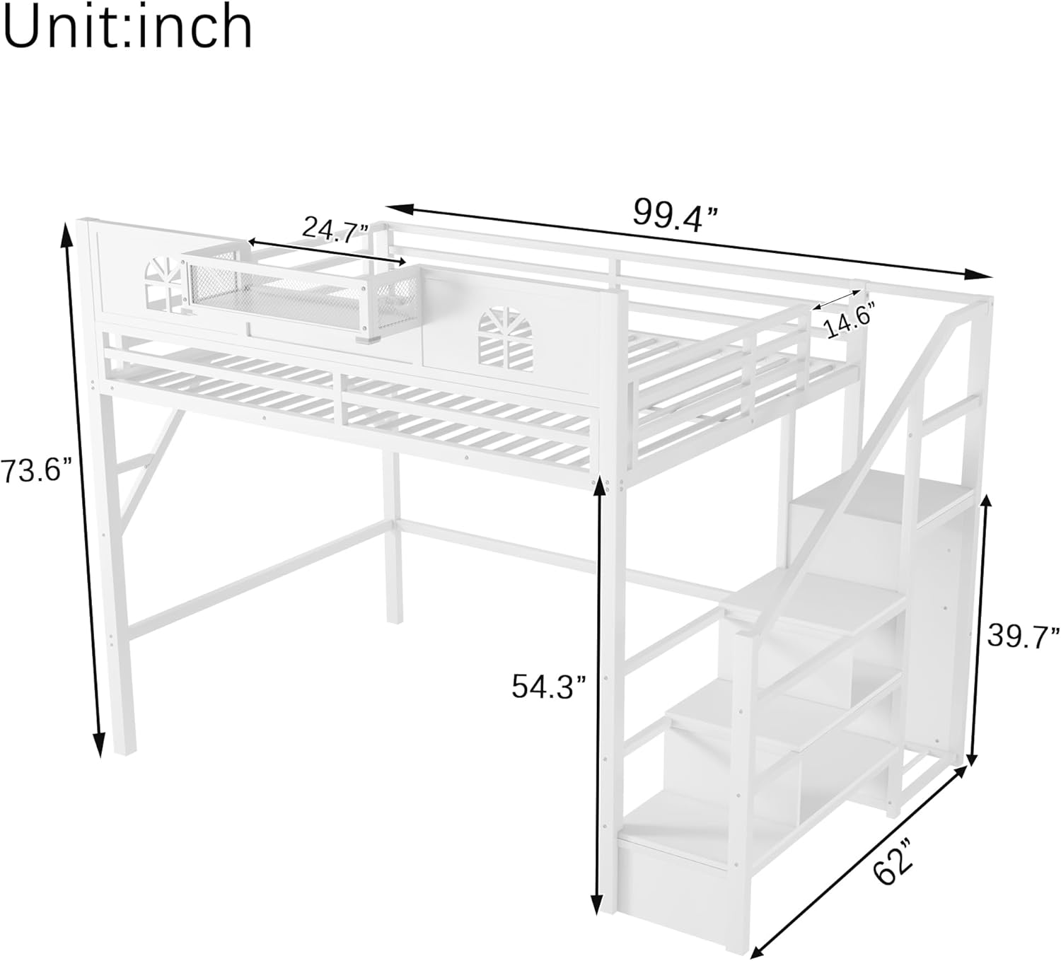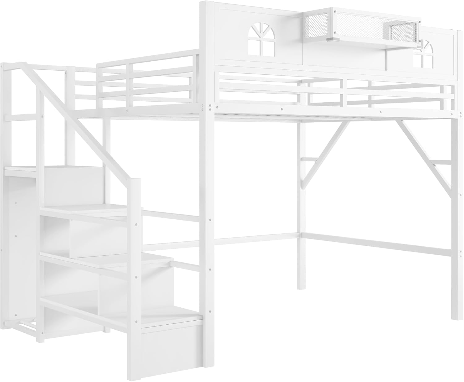 Queen Size Loft Bed with Stairs, Metal Queen Loft Bed with High and House Shaped GuardrailsThe loft bed has the space-saving functionality you are looking for to maximize your bedroom. This loft bed is all in one design integrates bed, wardrobe, stairs, and under bed area.SpecificationColor:WhiteMaterial:MetalOverall Dimensions:99.4” x 62”x 73.6” (L x W x H)Size:QueenUnder Loft Bed Space:54.3”Recommended Mattress Thickness:6”(mattress not included)Weight Capacity of Upper Bed: 400 lbsBox Spring Required: No