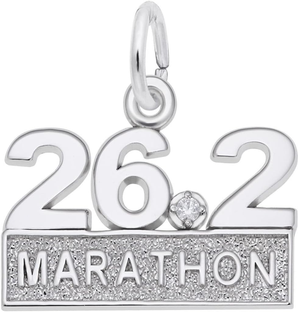 Classic marathon 26.2 w/ white spinel charm by Rembrandt. Measures approximately 0.43 inches x 0.07 inches (10.92mm x 18.01mm). Available in several metals.