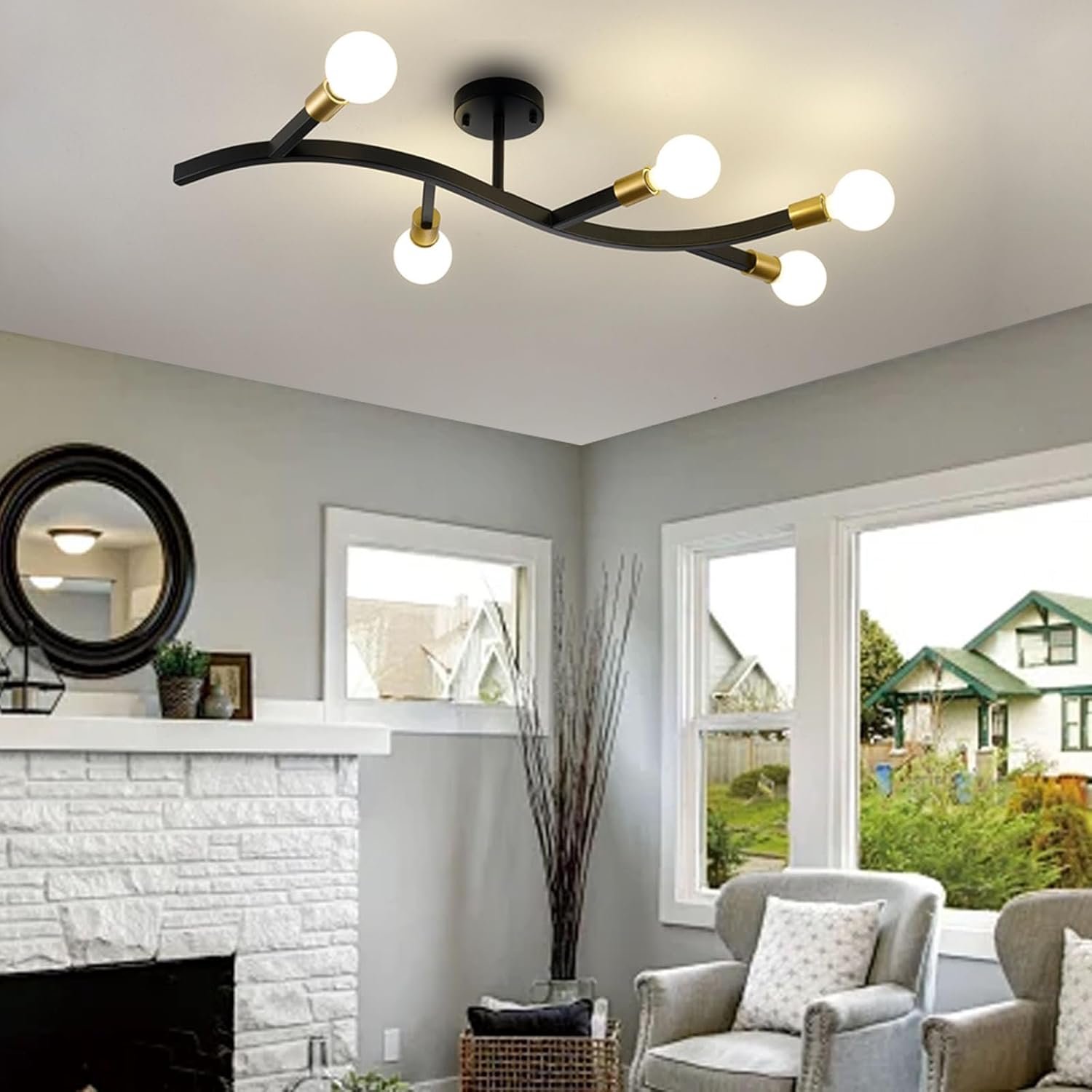 Bring timeless style and modern functionality into your home with this 5-Light Semi Flush Mount Sputnik Ceiling Light, designed specifically for homes that want the look of a chandelier without sacrificing ceiling height. Inspired by classic mid-century modern Sputnik design, this ceiling light features asymmetrical off-center arms finished in a sophisticated matte black and brushed gold color scheme. The clean lines and balanced structure create a bold visual statement while remaining minimalist and versatile enough to complement modern, mid-century, contemporary, or farmhouse interiors. Perfect Solution for Low Ceilings This semi flush mount ceiling light is designed with a compact profile, offering only 8–12 inches of clearance after installation. Unlike traditional chandeliers that hang too low, this fixture is ideal for low ceiling spaces, making it a practical and stylish choice for apartments, dining rooms, hallways, kitchens, entryways, and bedrooms. Bright and Even Illumination Equipped with five standard E26 bulb sockets (bulbs not included), this Sputnik ceiling light delivers balanced, evenly distributed lighting throughout the room. The open arm design allows light to spread freely, helping to eliminate dark corners while creating a warm and inviting atmosphere. Compatible with LED, Edison, and incandescent bulbs up to 60W each. Premium Materials and Durable Construction Crafted from high-quality metal, this fixture features a scratch-resistant matte black finish and brushed gold accents that maintain their appearance over time. The sturdy construction ensures stability and long-lasting performance, making it a reliable lighting solution for everyday use. Easy Installation and Reliable Support This semi flush chandelier comes with pre-wired branches, all necessary mounting hardware, and clear step-by-step instructions, allowing for a smooth and hassle-free installation. Designed to fit standard ceiling junction boxes. If you have any questions before or after purchase, our customer support team is ready to assist you within 24 hours. Upgrade your space with a ceiling light that combines mid-century modern design, practical low-ceiling functionality, and timeless elegance—a perfect lighting choice for stylish homes that value both form and function.