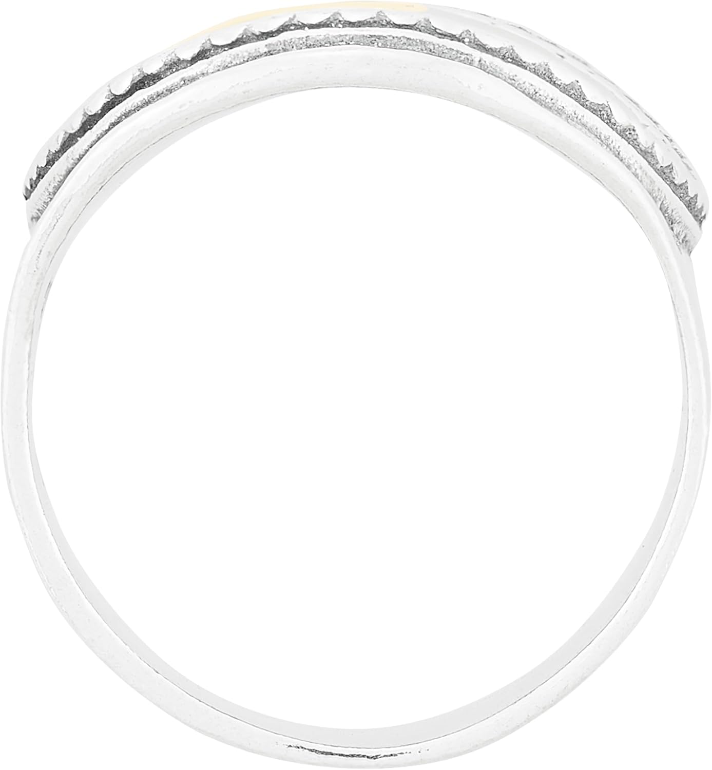 Take a look at this gorgeous and elegantly designed ring! It boasts a wide band made from shiny sterling silver and features a striking silver with 14K yellow gold plating center. This ring evokes a sense of strength and sophistication. Consider ordering one size up as the wide nature of this ring may cause it to fit snugly. The piece comes with a “.925” sterling silver quality stamp as a symbol of guaranteed product quality.
