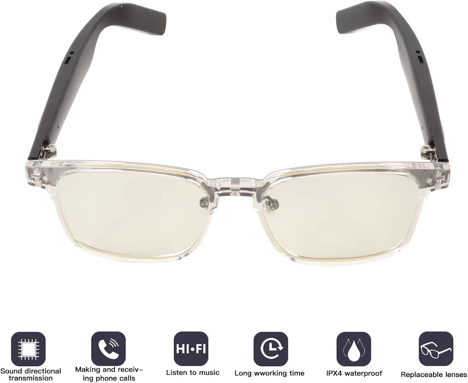 Spec:Item Type: Smart GlassesFrame Material: Lens Material: PCBluetooth: 5.3Channel: Dual Speakers, StereoBattery Capacity: 220mAh Lithium Battery (Left Glass Temple 110mAh, Right Glass Temple 110mAh) (Included)Charging Time: 90minLens Type: Anti Blue Light LensesControl Method: Touch controlWaterproof Grade: IPX4Charging Interface: Magnetic ChargingPackage List:1 x Bluetooth Smart Glasses 1 x Magnetic Charging Cable 1 x Glasses Cloth1 x Manual