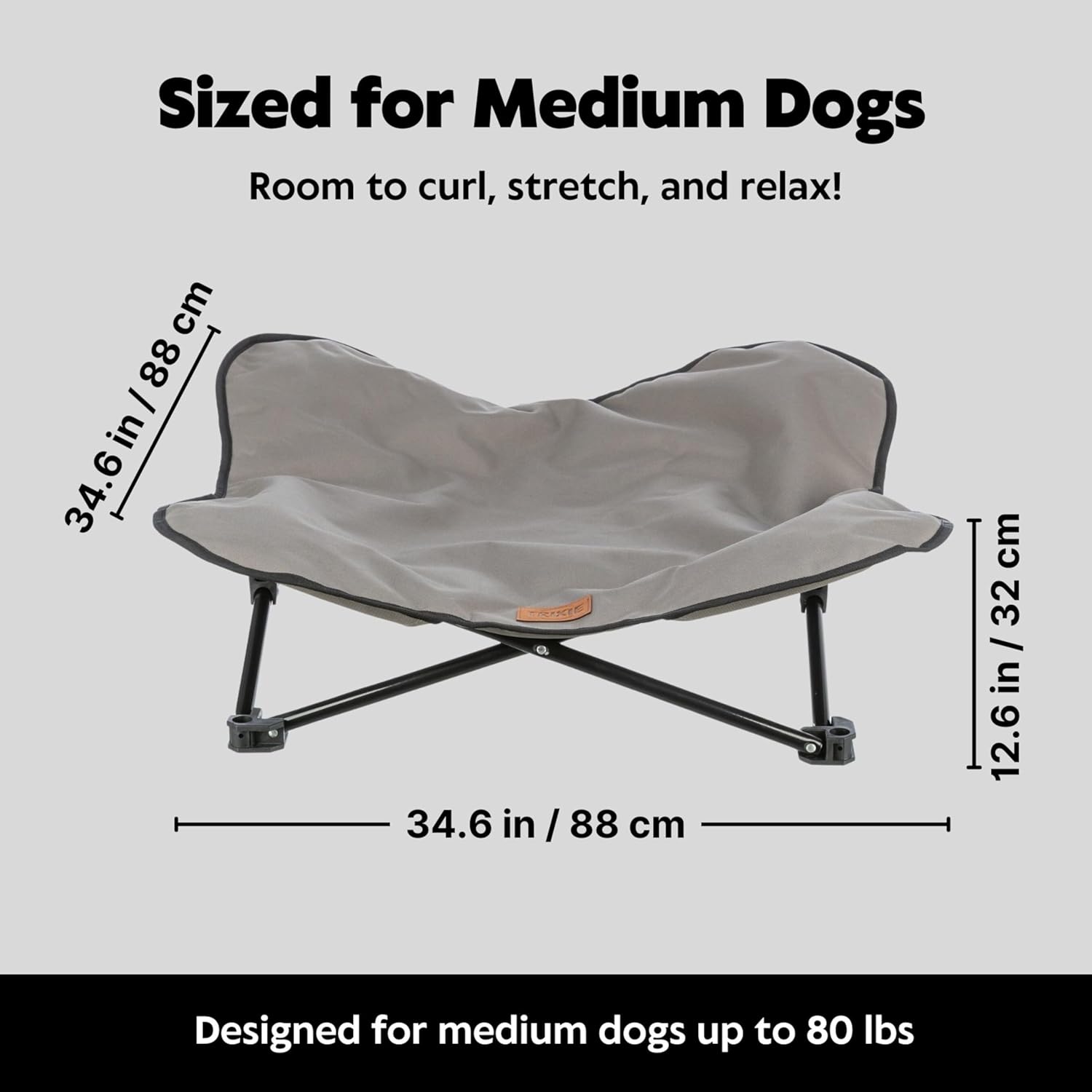 | Product Benefits | Comfortable, elevated bed for indoor and outdoor use, Foldable and portable pet cot for travel adventures, Perfect size for medium dogs, cot can support up to 80 lbs |