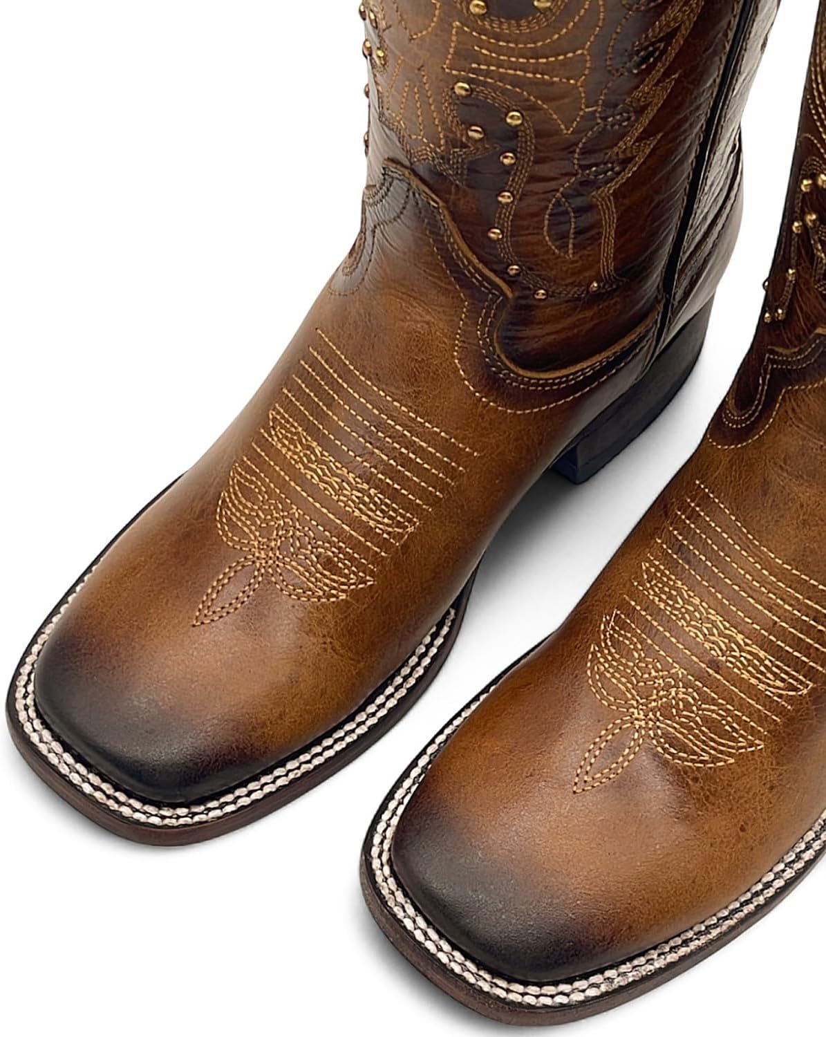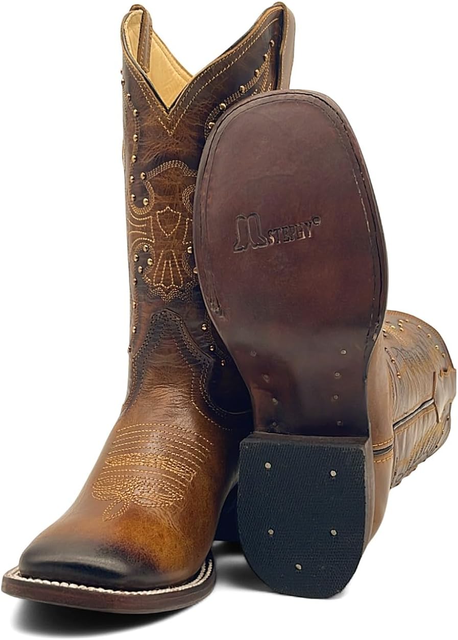 Women’s beautifully embroidered stud detail leather cowboy boot handcrafted and made in Mexico with maximum quality and comfort. The shaft measures approximately 11.5 inches with a 14” circumference. Heel measures approximately 1.25 inches. Features a square toe, durable leather soles, leather interior lining and leather stitched pull straps for easy pull up.
