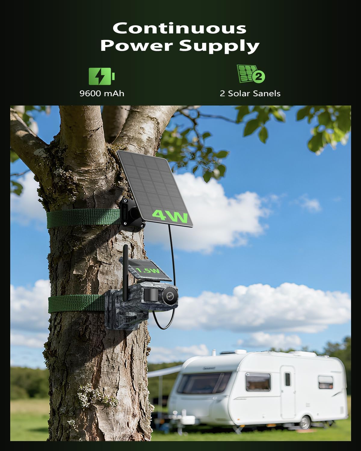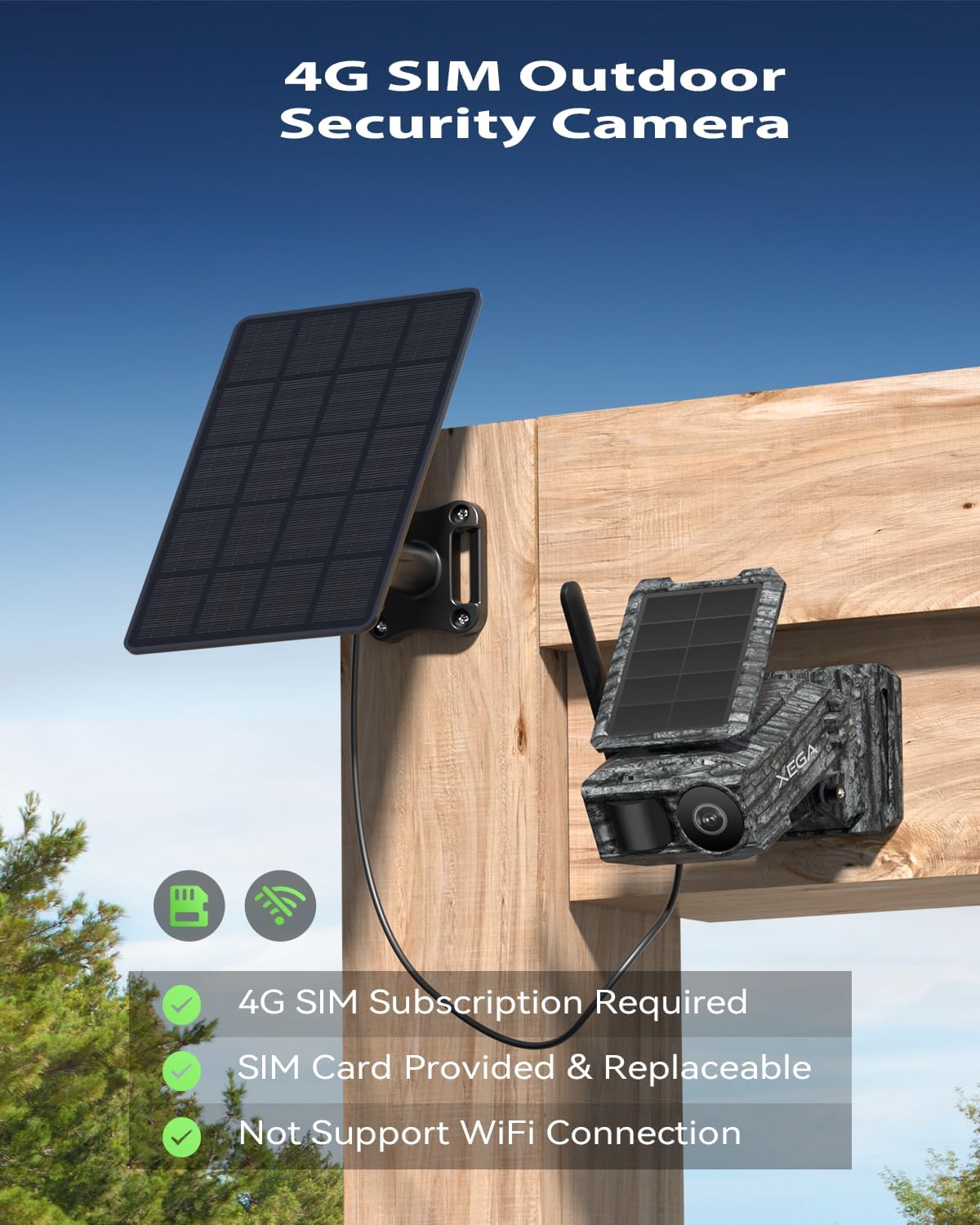 | Other Special Features of the Product | Requires a 4G Mobile Data Subscription, WiFi connection not supported. Only Support The Built-in SIM, SIM Card Non Replaceble(No SIM slot, Non Detachable). 9600mAh Removable Battery and Dual Solar Charging System (1.5W Integrated + 4W Separate Panels) . Camouflage Design Keeps it Unnoticeable Outdoors. 940nm Invisible Infrared LEDs That Won't Startle Animals. |