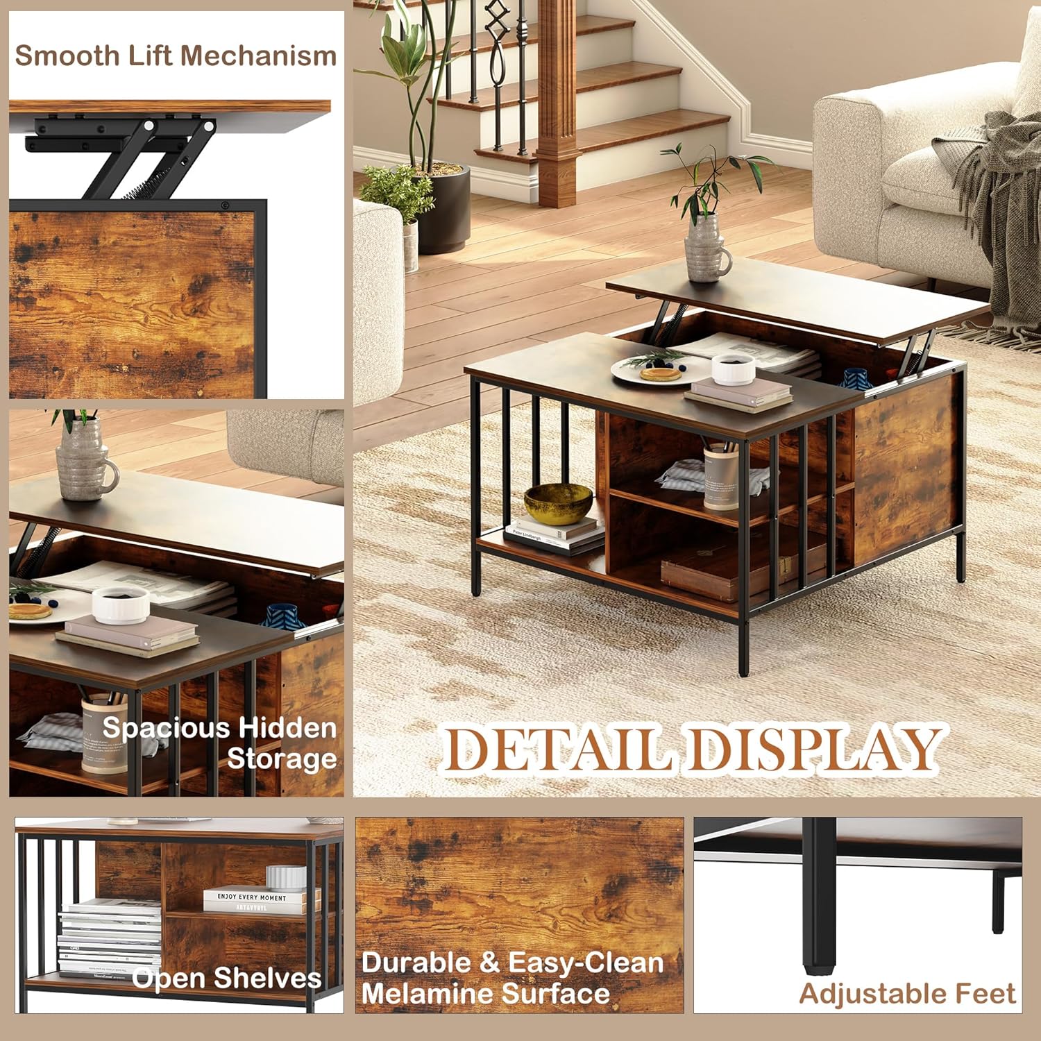 🔄【Smooth Lift-Top Mechanism for Work & Dining】Effortlessly adjust the height from 20.3" to 25.6" with an upgraded spring-assisted lift system, transforming your coffee table into a comfortable workspace or dining surface—perfect for working from home, laptop use, or casual meals on the sofa. No more hunching! 📦【Spacious Hidden Storage & Open Shelves】 Keep your living room clutter-free with a large hidden compartment (fits blankets, toys, game consoles) and three open shelves for books, decor, or snacks. Ideal for family storage needs and small-space organization. 🏡【Durable & Easy-Clean Melamine Surface】 Crafted with scratch-resistant, heat-proof melamine board (waterproof & low formaldehyde) and a sturdy metal frame, this table withstands daily spills, hot cups, and kids’ messes. Just wipe clean with a damp cloth—no stains or fuss! 🛡️【Farmhouse Chic Meets Industrial Stability】The warm wood-grain top and black metal legs blend rustic charm with modern durability, complementing farmhouse, Scandinavian, or industrial décor. Reinforced steel legs and 110 lb weight capacity ensure wobble-free stability. 🧩【Smart home-ready design features 】4-inch clearance for robot vacuums, adjustable leveling feet for perfect stability on any floor surface, and hassle-free assembly with numbered parts and clear instructions - making it the perfect modern coffee table for busy households.